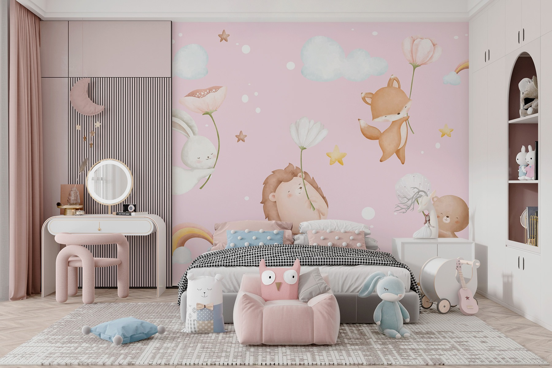 Brighten up any room with this delightful mural featuring a whimsical gang of animals, each holding flowers with a charm that’s simply irresistible. Imagine a playful bunny, a cheeky fox, a cuddly bear, and an adorable hedgehog, all frolicking together under a pastel sky. This friendly bunch brings a cheerful vibe, perfect for a child’s room or a cozy corner that needs a pop of joy. Its soft colors and sweet expressions create a warm, inviting atmosphere—who wouldn’t want to hang out here? Add a dash of playfulness to your space with these lovable friends and let the good times bloom!