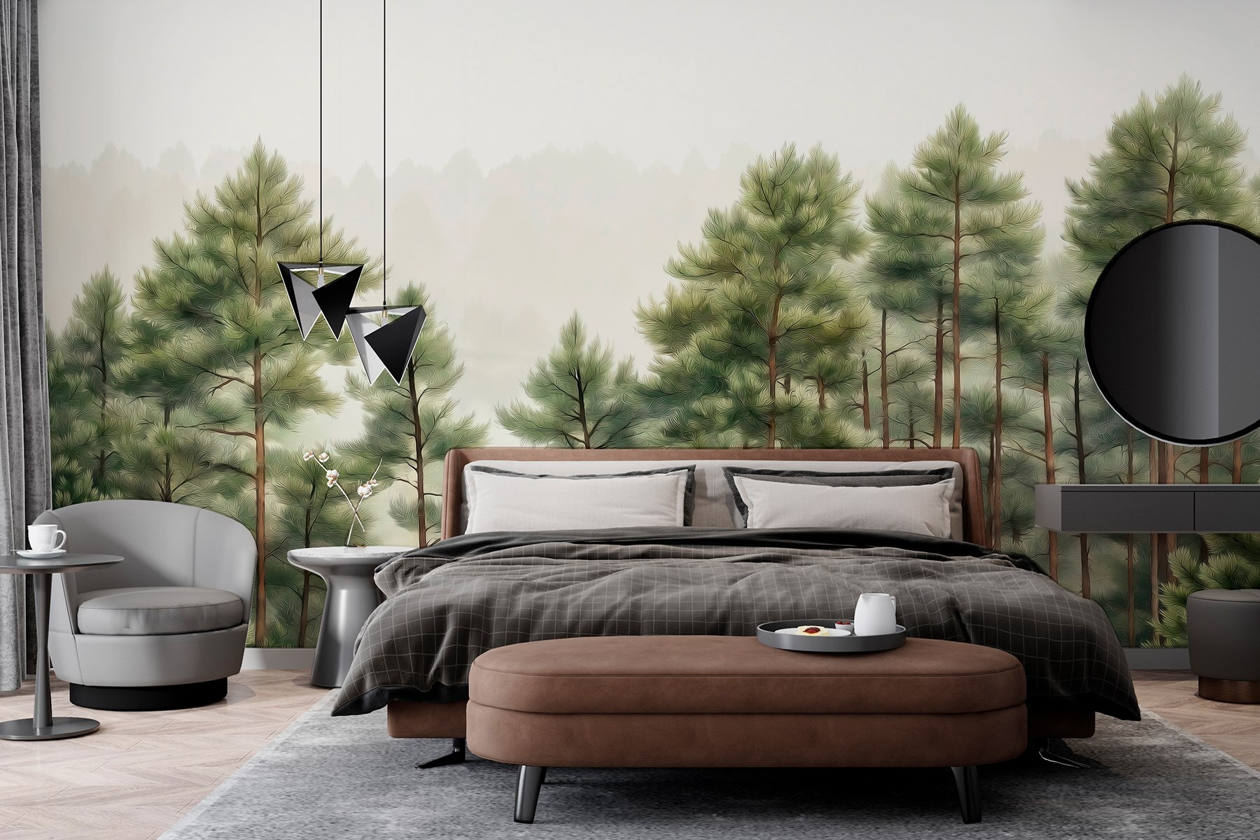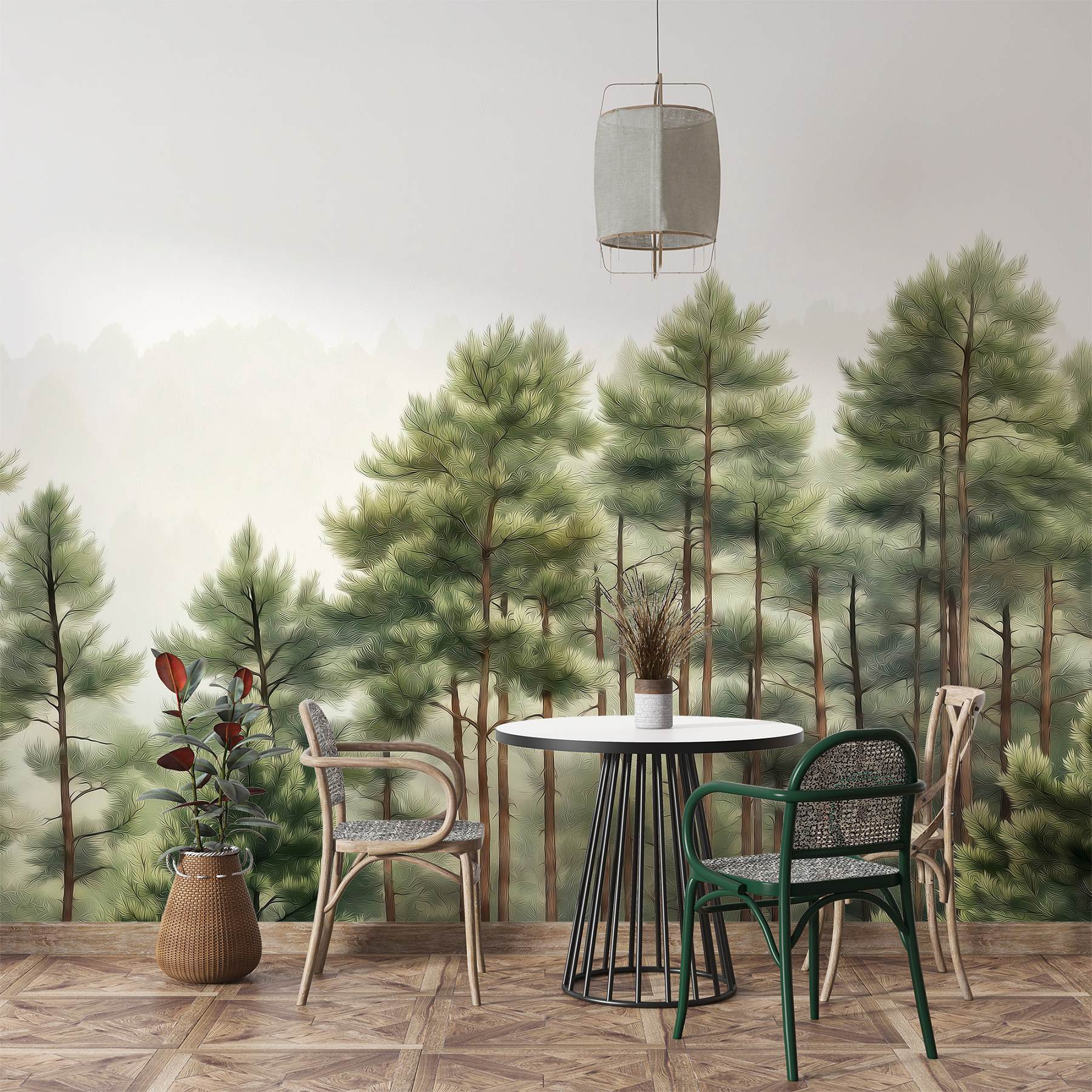 Transform any room into a serene forest retreat with this stunning mural of trees. It’s like stepping into a peaceful grove, minus the bugs and sticky sap. Just imagine sipping coffee in your cozy corner, surrounded by tall, whispering pines—no hiking boots required! The soft greens and gentle mist create an atmosphere that’s both calming and refreshing. Perfect for adding a bit of nature to your home, this mural invites the outdoors in, making every morning feel like a walk in the woods. Who wouldn’t want that?