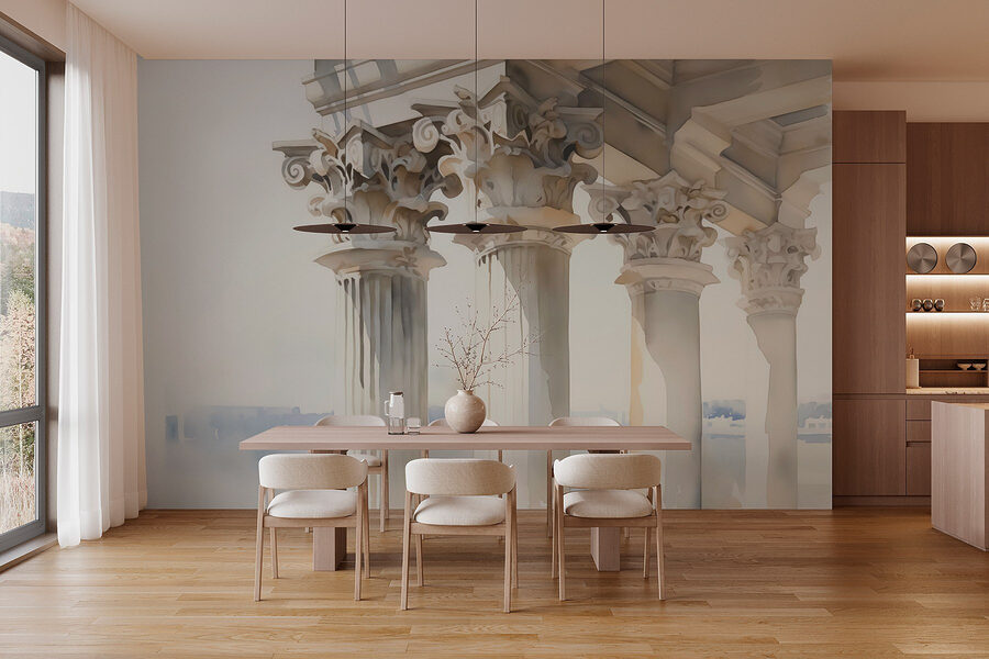 Transform any wall into a charming scene with this watercolor mural featuring graceful columns and a soft city background. Imagine stepping into a serene oasis every time you glance up. The gentle hues create an atmosphere that feels fresh and airy, perfect for sparking creativity or simply enjoying a peaceful moment with a cup of coffee. It’s like a little getaway in your own space. Friends might even think you’ve traveled to a picturesque destination! This mural effortlessly combines elegance and whimsy, making it a lovely addition to any room.