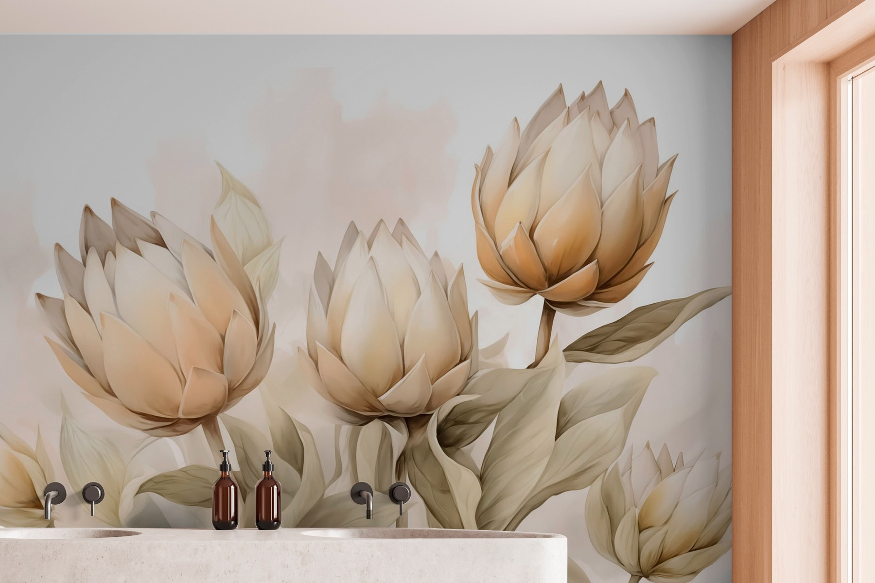 Transform any room into a serene escape with the “Elegant Blossoms in Soft Tones” mural. Its gentle hues of beige and cream evoke a feeling of calm, like sipping tea in a cozy nook. Imagine walking into a space graced by delicate blooms, softly whispering nature’s beauty—perfect for a morning coffee or a quiet evening with a book. This mural’s subtle charm adds elegance without shouting for attention, making it a fab choice for any decor enthusiast. It’s not just decor; it feels like inviting a tranquil garden right into your home. Who wouldn’t feel a little more zen with that kind of vibe?