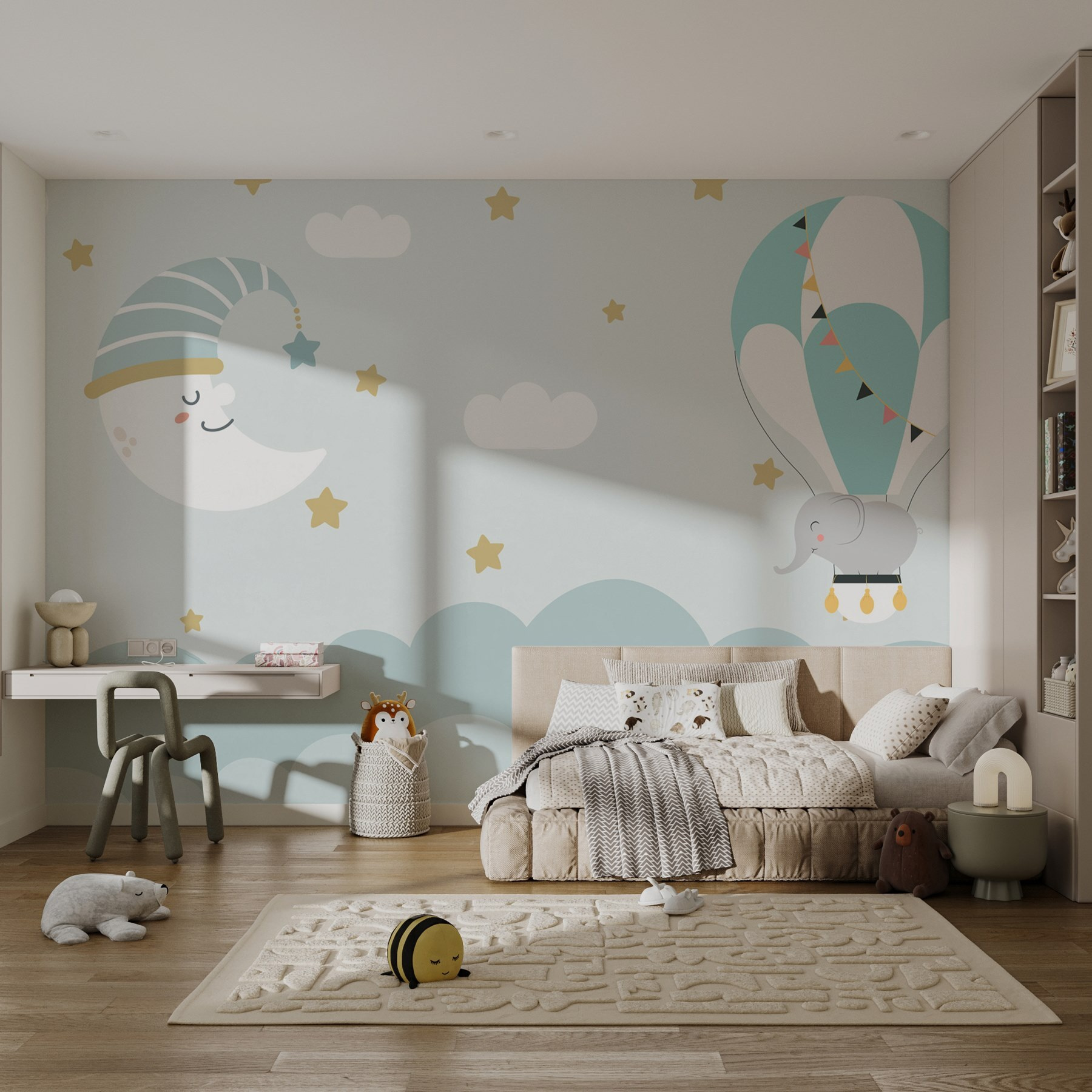 Transform any room into a dreamy escape with this charming wall mural featuring a playful elephant floating in a hot air balloon and a whimsical moon. Perfect for a nursery or playroom, it invites smiles and stirs imaginations. Picture cozy bedtime stories under the gaze of a smiling moon, all while your little one drifts to sleep inspired by adventures in the clouds. With soft pastel tones, it creates a serene vibe, making it an adorable backdrop for those tiny hands and big dreams. Who wouldn’t want to share a space with a friendly elephant? It’s like having a playful buddy keeping watch during the night.
