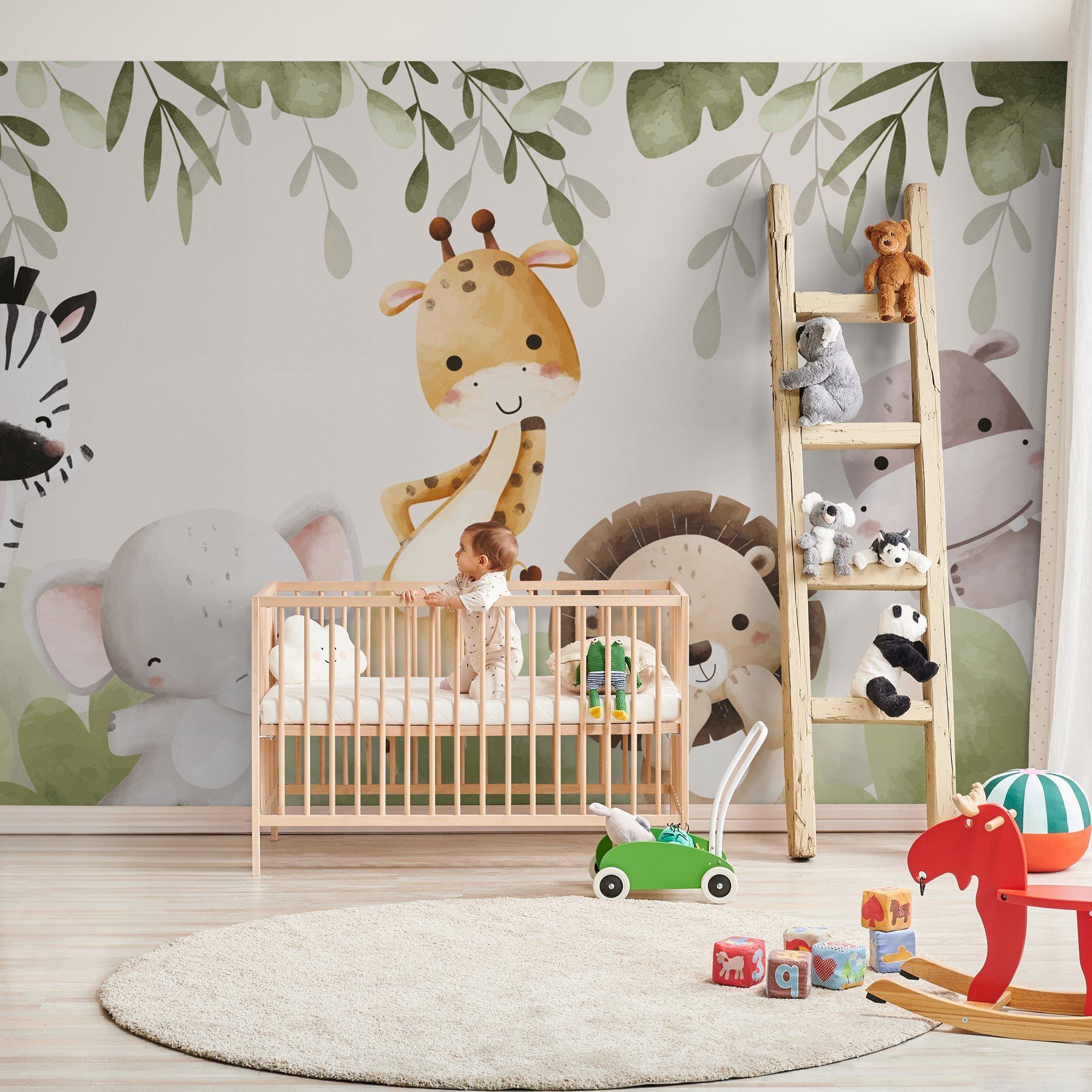 Transform any room into a vibrant jungle with this delightful mural, “Group of Animals Under Leaves.” Picture a playful zebra, an adorable elephant, a charming giraffe, a cheeky lion, and a friendly hippo—all hanging out like it’s their day off from the savannah. It’s the kind of artwork that instantly sprinkles joy and whimsy into a nursery or playroom. Just imagine little ones giggling as they point at their new animal pals. It’s such a warm and inviting backdrop that even adults can’t help but smile. Perfect for those who believe that home should feel like an adventure! Who wouldn’t want this lively gang keeping them company?