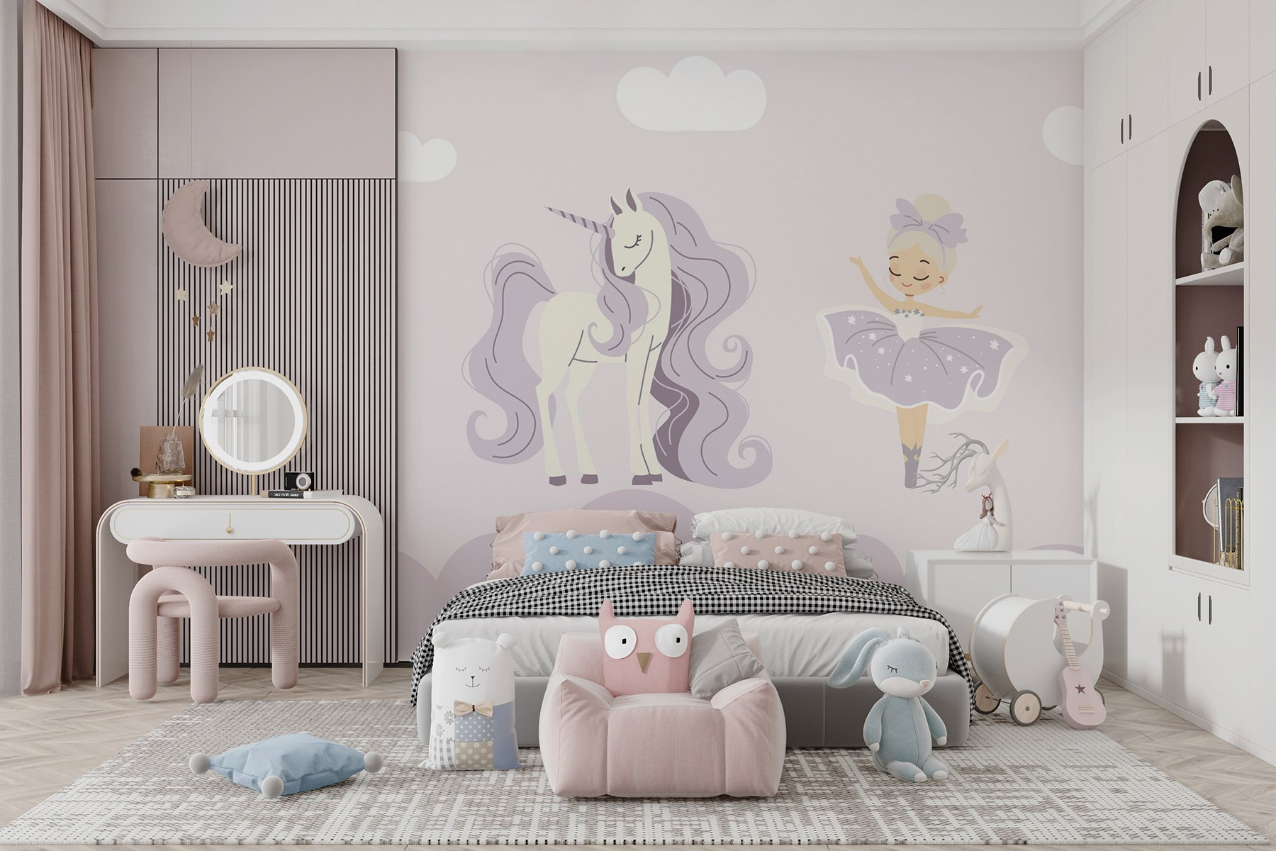 Transform a plain wall into a dreamy escape with this enchanting mural featuring a whimsical unicorn and a delightful ballerina. Picture walking into a room that feels like it’s part of a fairytale—soft hues and playful characters invite a sense of wonder, perfect for kids or the young at heart. Imagine the giggles of little ones dancing around, their imaginations soaring! It’s like bringing a sprinkle of magic into any space, where every glance could inspire a new daydream. Quite the charm, isn’t it? Perfect for bedrooms or playrooms, it’s a conversation starter, too—who wouldn’t want to share tales of ballet and mythical creatures?