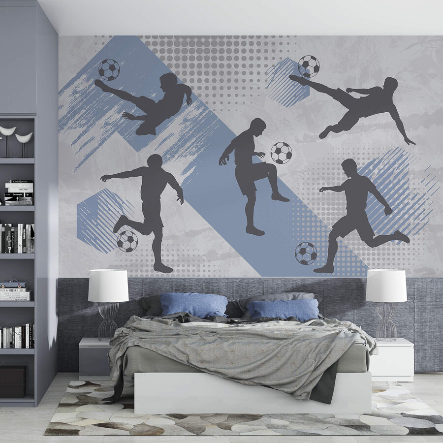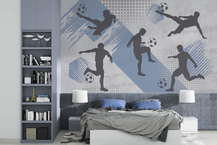 Transform a drab wall into a lively scene with this mural featuring a group of men joyfully playing football. It’s perfect for the soccer fan who believes every day should feel like match day—complete with thrilling goals and that unmistakable buzz of competition. Imagine stepping into a room where excitement hangs in the air, where every glance at those athletes in motion might just inspire a spontaneous kick in the living room. The vibrant blues and dynamic patterns add a playful energy, making it a conversation starter. Who wouldn’t want a slice of that spice right at home? Perfect for a game room, kids’ play area, or even a cozy den. Give your space that extra flair—go ahead, let the good vibes roll!