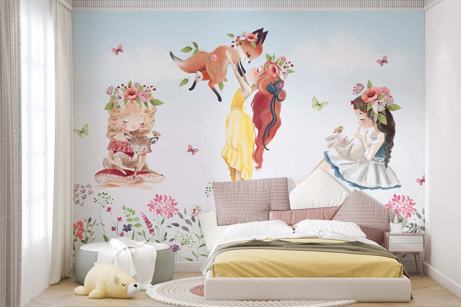 Brighten up any space with this enchanting wall mural featuring a delightful gathering of girls and their furry friends in a vibrant field of flowers. Can you picture it? Little ones twirling around, giggling at the sight of a playful fox or a gentle deer. It’s like stepping into a charming fairytale! Each girl, with her floral crown, brings a touch of whimsy that’s just perfect for a child’s room or play area. The soft colors and lively blooms invite daydreams and spark imagination, making every glance feel like a warm hug. It’s more than decor; it’s an invitation to explore a world where joy thrives!