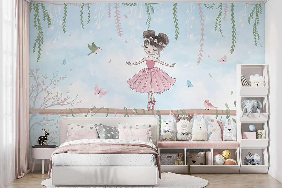 Step into a dreamy world with this enchanting mural featuring a charming girl in a pink dress, perfectly poised on a branch. Surrounded by fluttering butterflies and playful birds, it’s like a scene right out of a delightful fairy tale. Imagine this brightening up a cozy reading nook or sparking joy in a little one’s room. The soft colors and whimsical details invite smiles, making every glance feel like a warm hug. Just picture sipping tea, gazing at her grace, and getting lost in the stories she inspires—seriously, who wouldn’t want that? This mural isn’t just decor; it’s a magical escape!