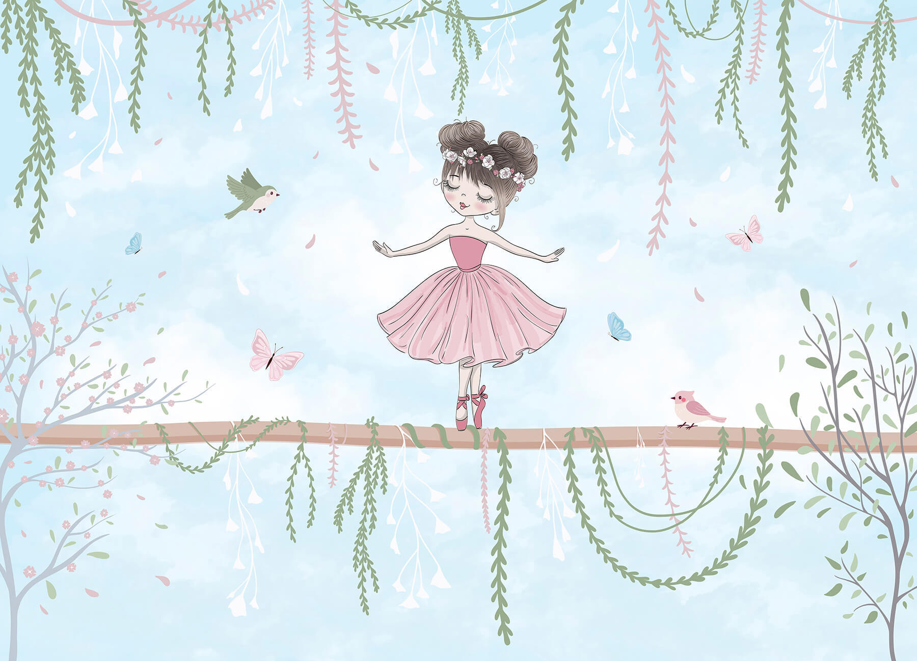 Step into a dreamy world with this enchanting mural featuring a charming girl in a pink dress, perfectly poised on a branch. Surrounded by fluttering butterflies and playful birds, it’s like a scene right out of a delightful fairy tale. Imagine this brightening up a cozy reading nook or sparking joy in a little one’s room. The soft colors and whimsical details invite smiles, making every glance feel like a warm hug. Just picture sipping tea, gazing at her grace, and getting lost in the stories she inspires—seriously, who wouldn’t want that? This mural isn’t just decor; it’s a magical escape!