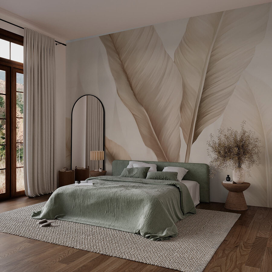 Transform any room into a tranquil oasis with this lovely mural featuring delicate leaves dancing on a soft background. It’s like bringing a little slice of nature indoors—perfect for those who’d love a tropical escape without leaving the sofa. Imagine sipping your morning coffee while subtly surrounded by these calming tones. It’s easy on the eyes, too—no neon colors here, just soothing shades that tell your walls, “Hey, let’s chill out.” Whether it’s a cozy reading nook or a lively living room, this mural whispers peace while making a stylish statement. Plus, it adds that perfect touch of sophistication. Who doesn’t love a little elegance with their indoor greenery?