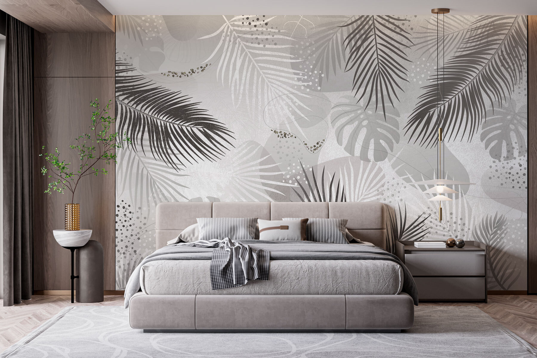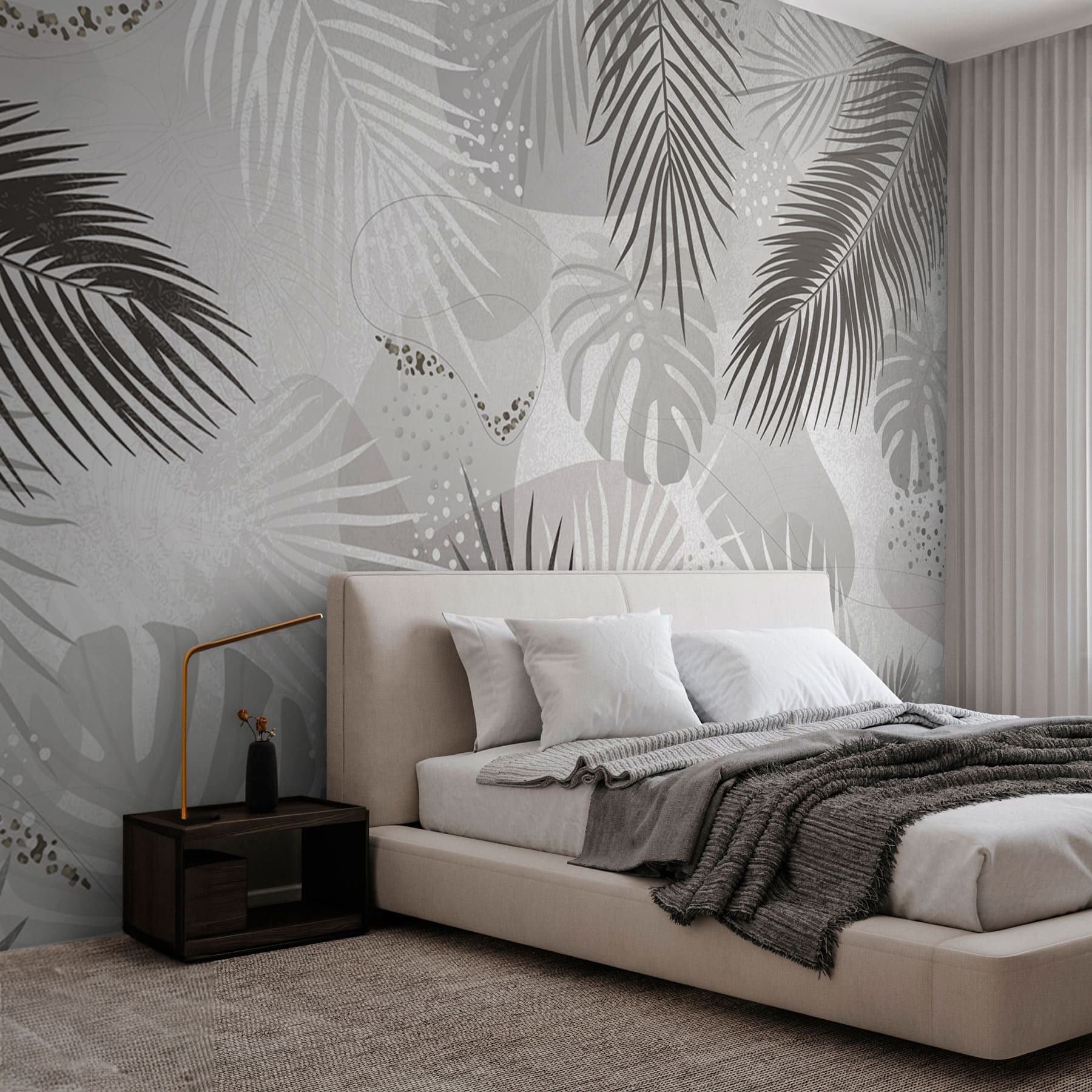 Transform any room with this stunning wall mural, featuring a chic grey and white background adorned with elegant leaves. It’s like bringing a whisper of the tropics right into your home, minus the humidity! Imagine stepping into your living space and feeling nature’s calm wash over you. The playful interplay of shades can spark some serious style envy, especially during gatherings—everyone will be asking where you found it. This mural doesn’t just decorate; it creates a vibe, turning bland walls into a statement. Perfect for anyone looking to add a touch of modern flair while keeping things serene and sophisticated. Who knew a wall could be this inviting?