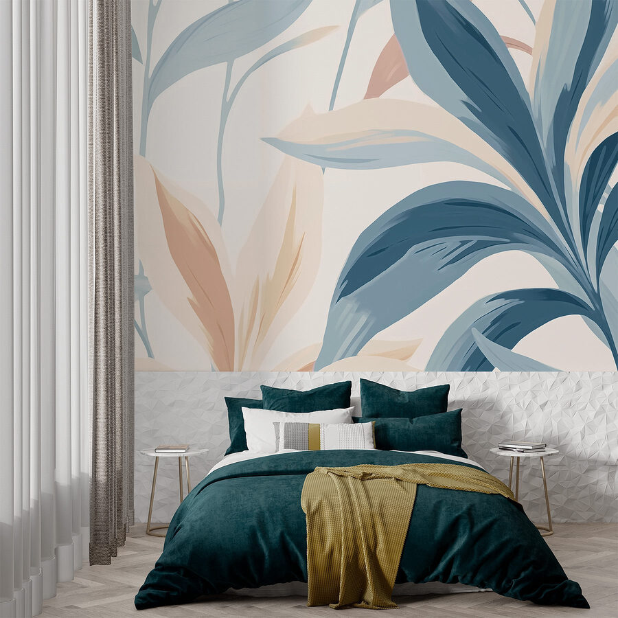 Looking to bring a touch of nature indoors? This wall mural, with its dreamy abstract leaf design, might just be the ticket. Imagine walking into a room and being greeted by gentle hues of blue and soft earth tones. It feels like an open meadow, but without the pesky bugs—what a win!