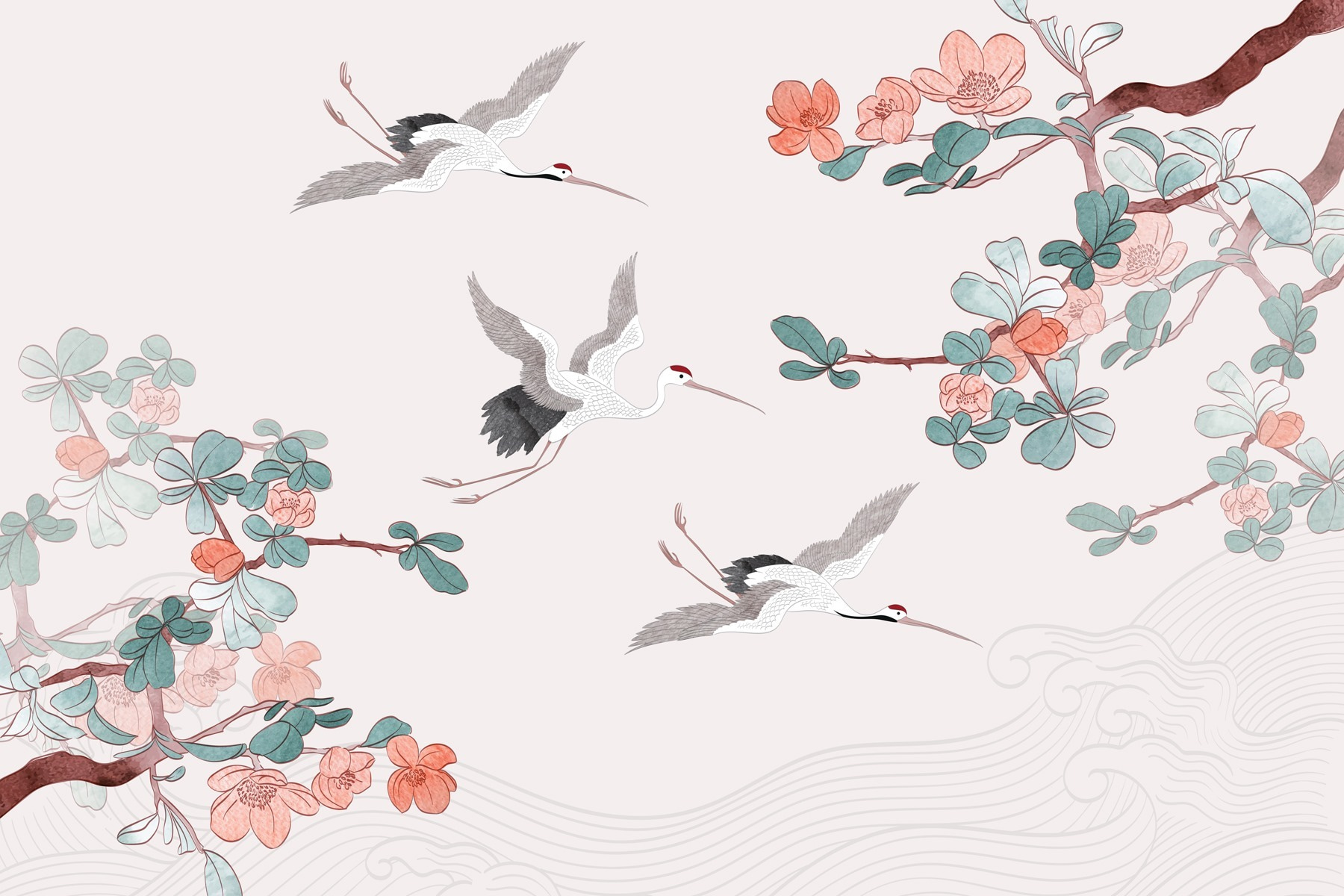 Transform your space with this stunning mural featuring a graceful group of birds soaring through the air. It’s like inviting a breath of fresh air into your room—no need for a window when you’ve got this beauty on your wall. The delicate blossoms and the serene colors create a vibe that’s both calming and energizing. Imagine sipping your morning coffee while gazing at these elegant creatures—seriously, it’s an instant mood lifter! Plus, who doesn’t love a little nature indoors? It’s chic, it’s stylish, and it’s sure to spark a few compliments when friends drop by. Perfect for a living room or a cozy nook, this mural is here to add a sprinkle of wonder to your day!