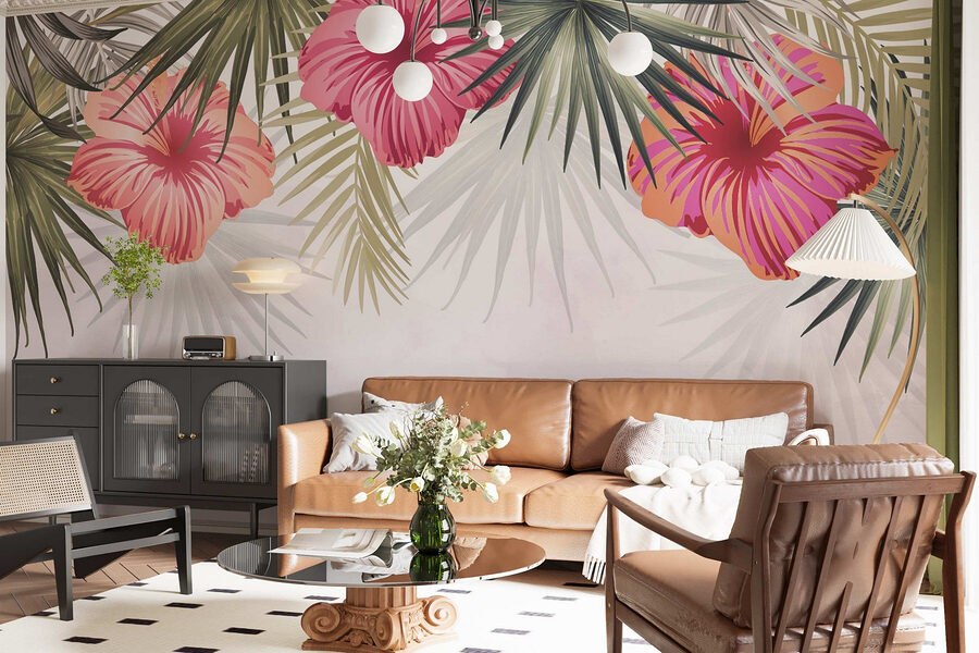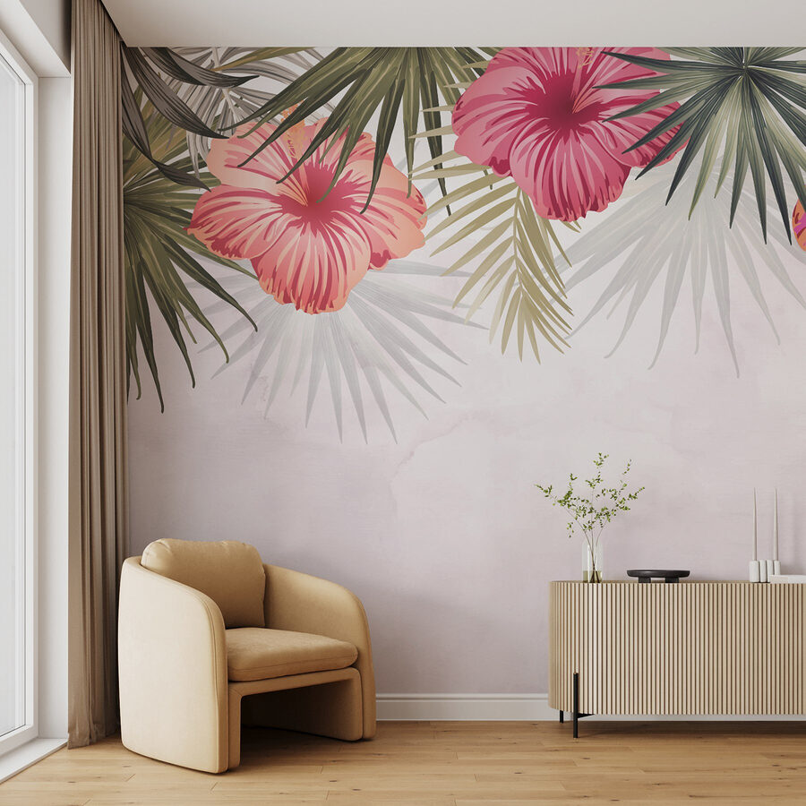 Transform any room into a tropical paradise with this stunning mural of pink flowers mingling with lush green leaves. It feels like a little slice of nature right in your home, perfect for brightening up a dull space. Imagine having morning coffee while surrounded by these vibrant blooms—might even inspire some daydreaming! The colors pop against a soft background, making it a statement piece without screaming for attention. Sure, plants need watering, but this beauty’s low-maintenance! Perfect for those seeking a hint of the outdoors—without worrying about plant care. So, go ahead, let your walls bloom!