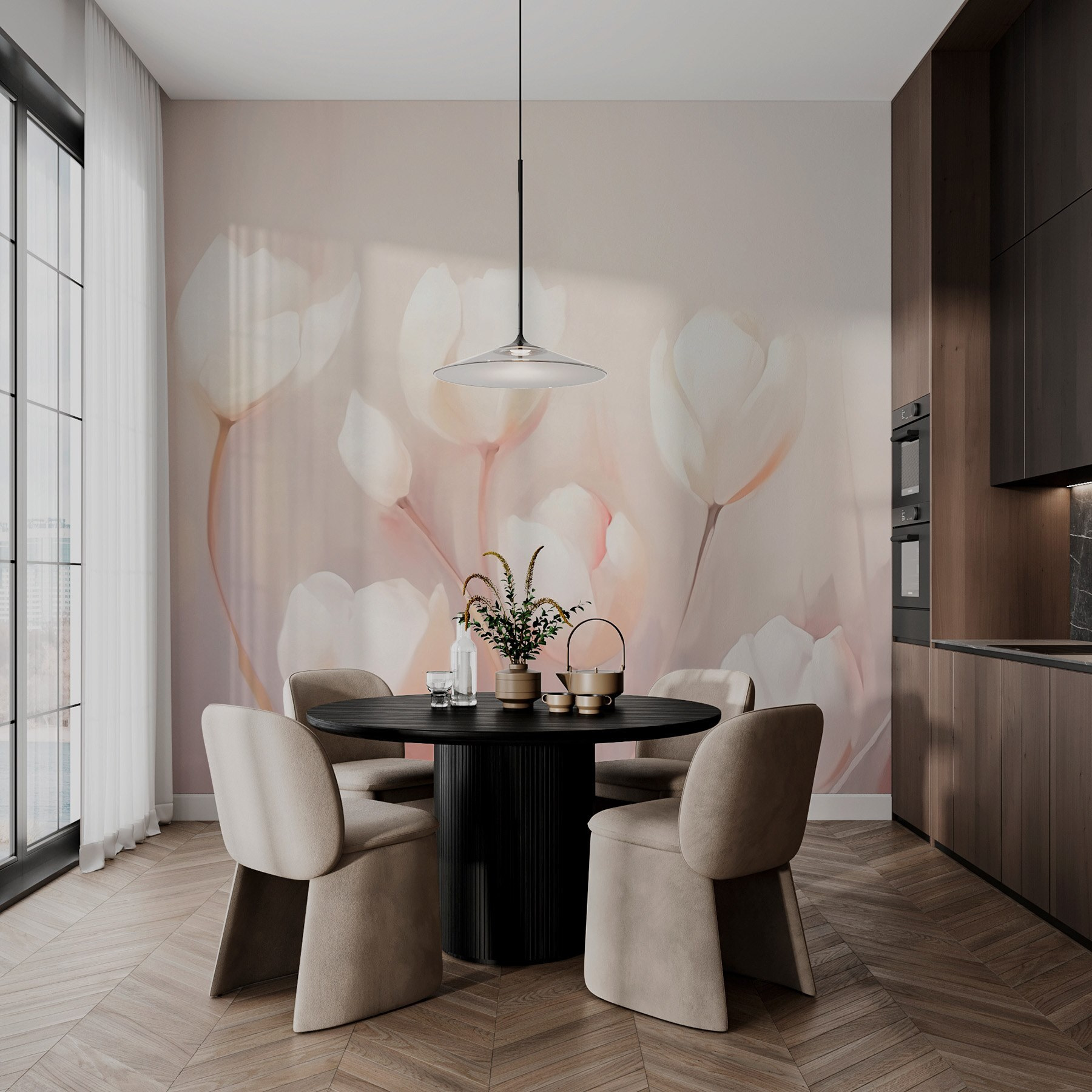 Step into a world where gentle hues of soft petals wrap around your walls, inviting a touch of nature right into your space. This mural, “Soft petals in gentle hues,” has a dreamy quality that transforms any room into a serene garden retreat. Imagine waking up to these delicate white blooms whispering peace and calm—talk about a morning mood booster! Friends might pop in, see this beauty, and wonder if they’ve stumbled into a flower shop. It’s like having a slice of spring all year round. Perfect for cozy corners or open spaces, this mural delivers elegance with just the right amount of charm. Let your walls blossom!