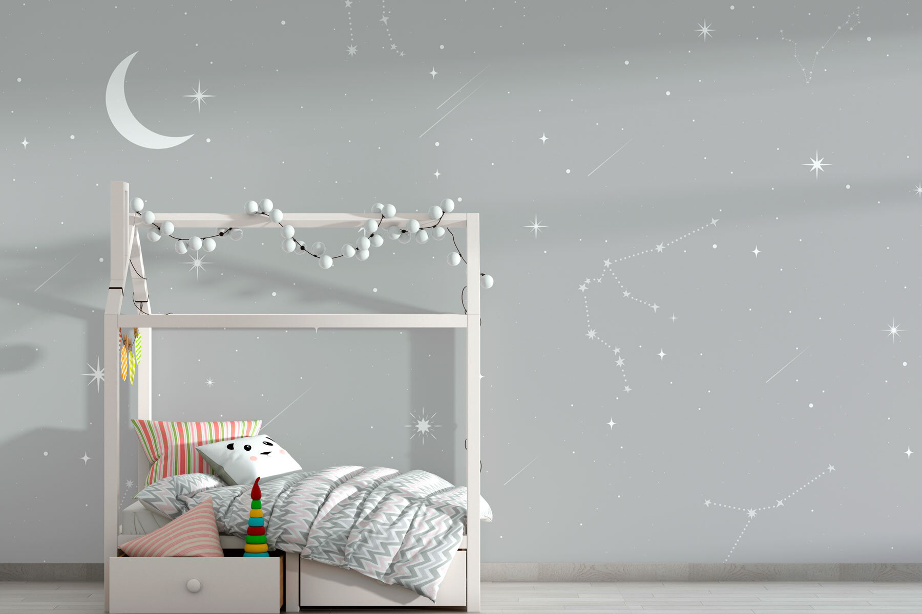 Transform your space into a dreamy escape with the “Grey Sky with Stars and Moon” mural. Imagine gazing around your room and spotting constellations twinkling softly against a serene backdrop. It’s like bringing a piece of the night sky indoors—sans the mosquitoes! Perfect for cozy corners, nurseries, or even that one wall that’s been crying out for attention. The gentle hues create a calming atmosphere, making it your go-to spot for unwinding after a long day. Plus, who wouldn’t love a reminder of the vast universe right at home? Time to turn that wall into your own little galaxy.
