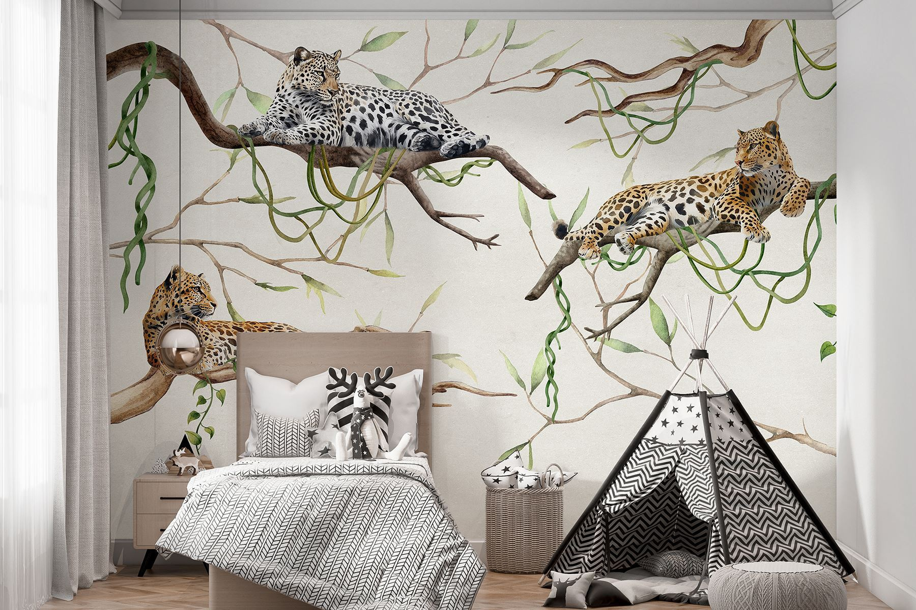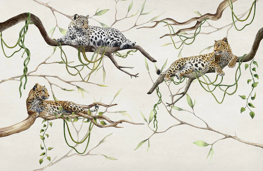 Transform your space into a tropical oasis with this stunning wall mural of leopards lounging on branches. Imagine stepping into the room and feeling the warmth of the jungle, as these majestic big cats seem to watch over you, perfectly relaxed among the vibrant greenery. It’s got that perfect blend of wild and serene, bringing a touch of nature inside without worrying about actual animal antics. Friends might even joke that you’re secretly a wildlife photographer—minus the hiking boots and mosquito bites. So go ahead, let your walls tell a story, wrapping your space in a cozy, exotic escape. Perfect for living rooms or a unique office vibe, this mural’s ready to make any room feel alive with natural beauty.