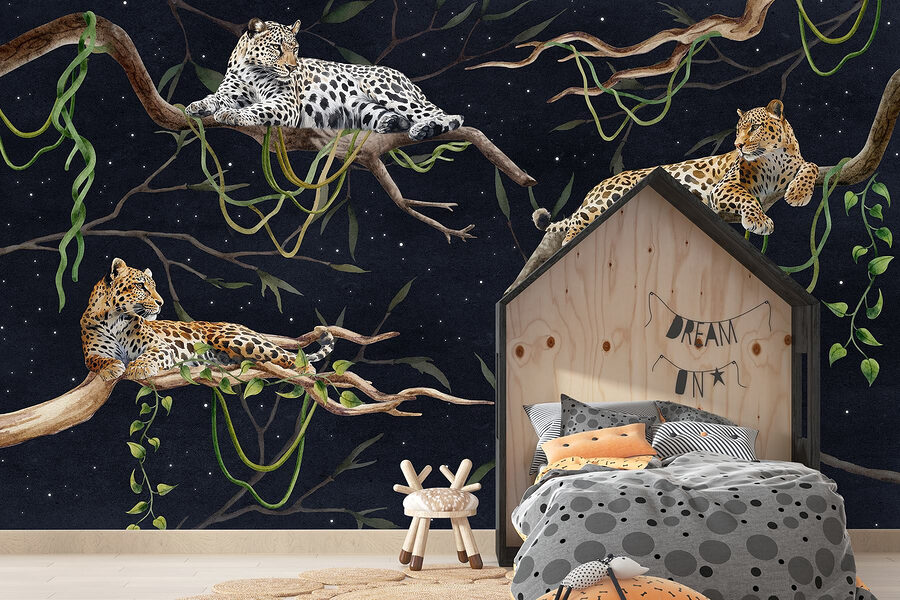 Transform your walls into a wild oasis with this stunning mural of leopards lounging gracefully on branches. It’s like inviting a piece of the jungle right into your living room—without the humidity or pesky mosquitoes! Imagine sipping your morning coffee while they keep you company, looking oh-so-casual and effortlessly cool. The rich colors and intricate details are a feast for the eyes, perfect for adding a touch of elegance to any space. Whether you’re a nature lover or just someone who appreciates unique art, this mural’s warmth and charm can spark conversations and bring a cozy vibe. Plus, who wouldn’t want a trio of leopards hanging around? They might just become the new focal point of your home!