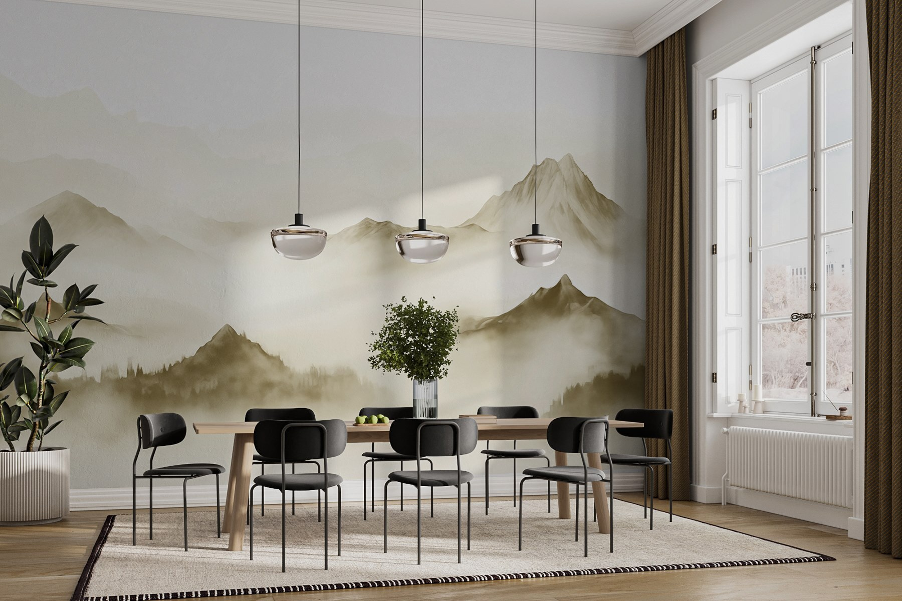 Transform a dull wall into a dreamy escape with the “Foggy Mountain Range” mural. Imagine waking up to soft, watercolor peaks shrouded in mist, inviting a sense of calm and adventure. It’s like having nature’s beauty right in your living room—no hiking boots required! The warm, earthy tones add cozy vibes, perfect for sipping coffee or curling up with a good book. Plus, it’s an easy way to wow friends when they see your space—“Oh wow, you’re so artsy!” Trust us, this mural might just spark those deep chats about life or even inspire a spontaneous getaway. Perfect for anyone craving a little nature without the mud!