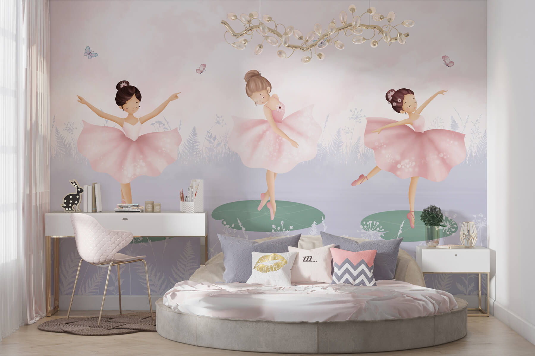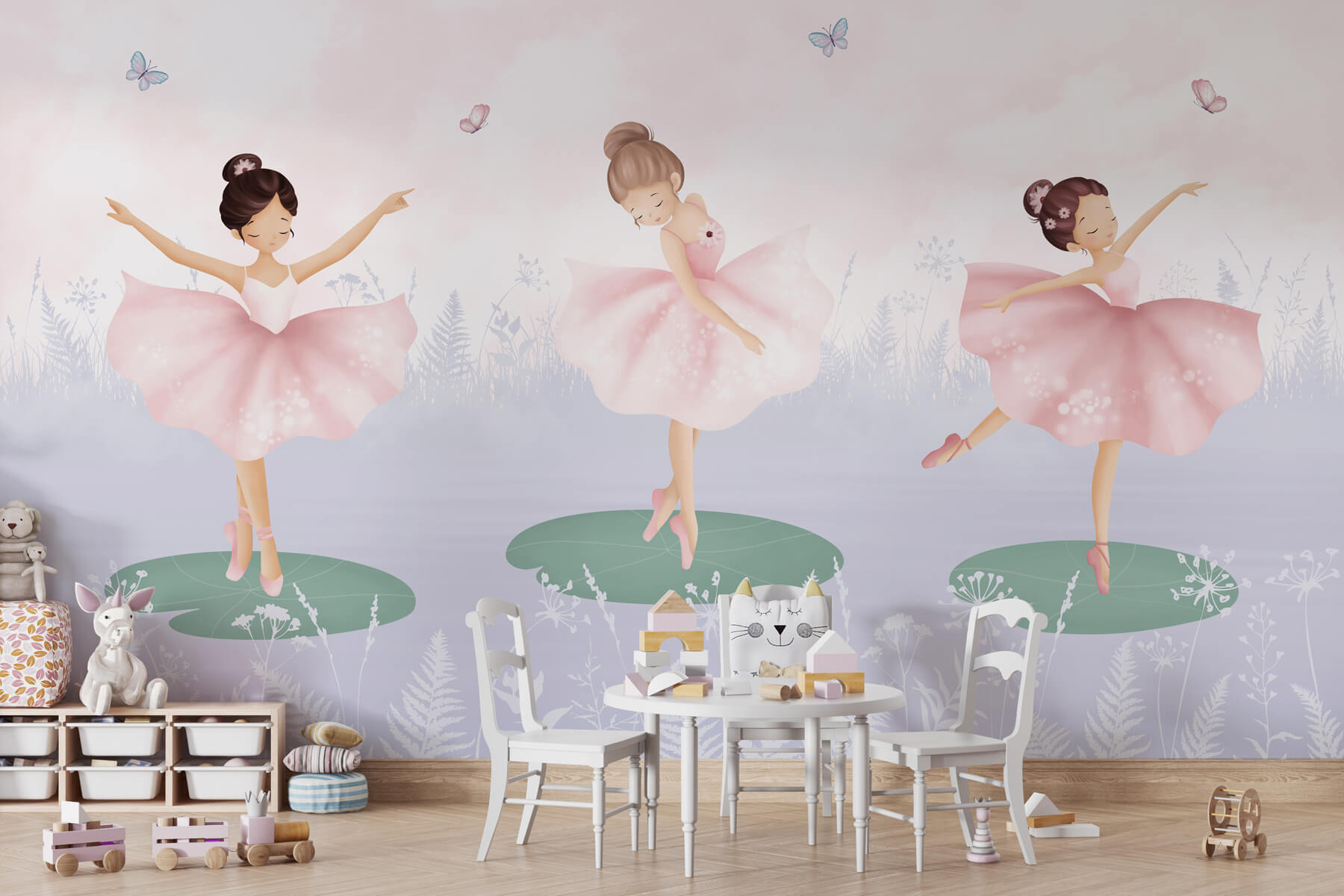 Transform any space into a dreamy paradise with this enchanting wall mural featuring a trio of girls in tutu skirts dancing on lily pads. Imagine little feet twirling and twinkling, surrounded by fluttering butterflies while gentle whispers of nature fill the air. It’s perfect for a child’s room or play area, lighting up the walls with joy and imagination. The soft pastels create a calm vibe, making it feel like a scene from a fairytale. Just picture the smiles and giggles it’ll inspire during playtime. It’s a delightful reminder that every day can feel like a magical adventure!