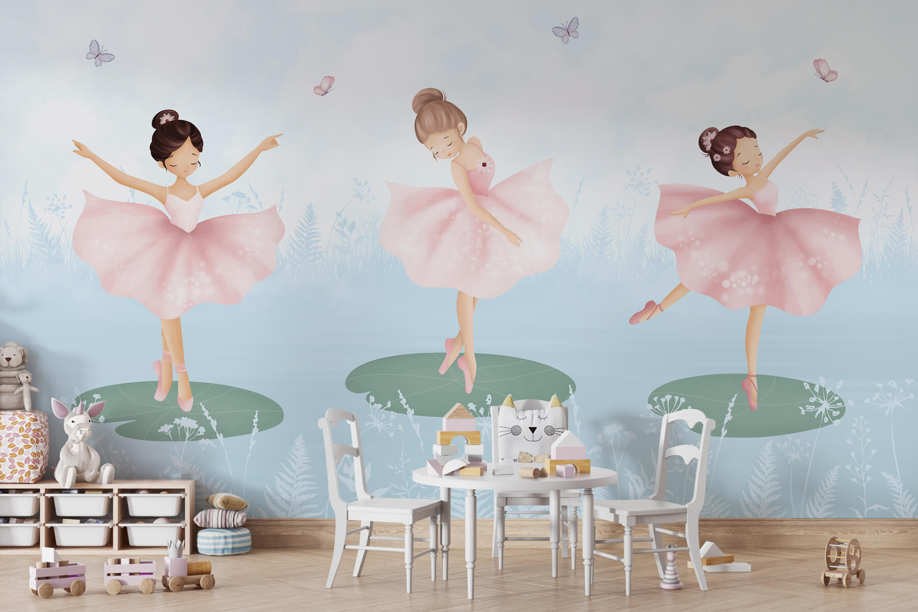 Transform any room into a whimsical wonderland with this delightful wall mural featuring a trio of girls in pink tutus dancing on lily pads. Just imagine—bright butterflies fluttering around, while soft greens and blues create a serene backdrop. Perfect for a nursery or playroom, this mural invites giggles and daydreams. It’s like having an enchanting fairytale right on the wall, sparking imagination and joy. Friendships, laughter, and dance parties? Yes, please! Every glance at this mural is sure to wrap the space in warmth and charm. A sweet touch that feels like a hug!
