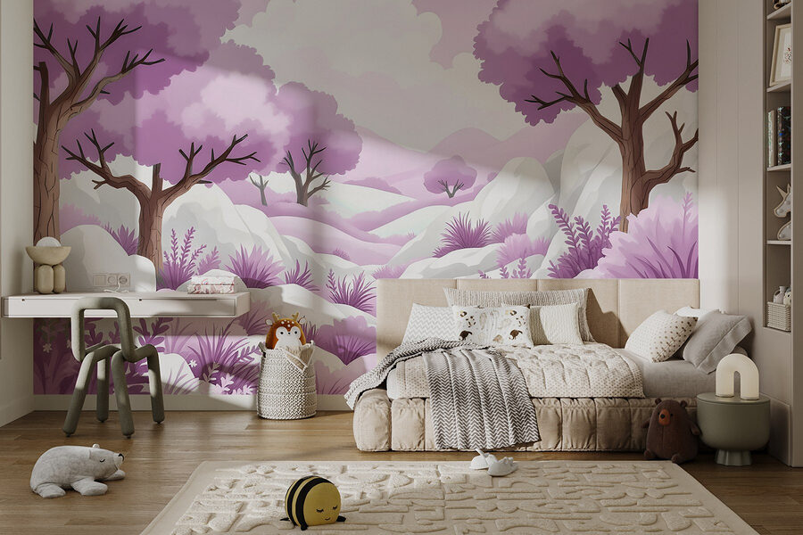 Transform any room into a dreamy escape with this enchanting wall mural, “Landscape with Trees and Snow.” Picture stepping into a whimsical forest, where soft lavender trees sway gently, surrounded by fluffy snow and delicate plants. It’s like a magical world where winter plays nice with spring!