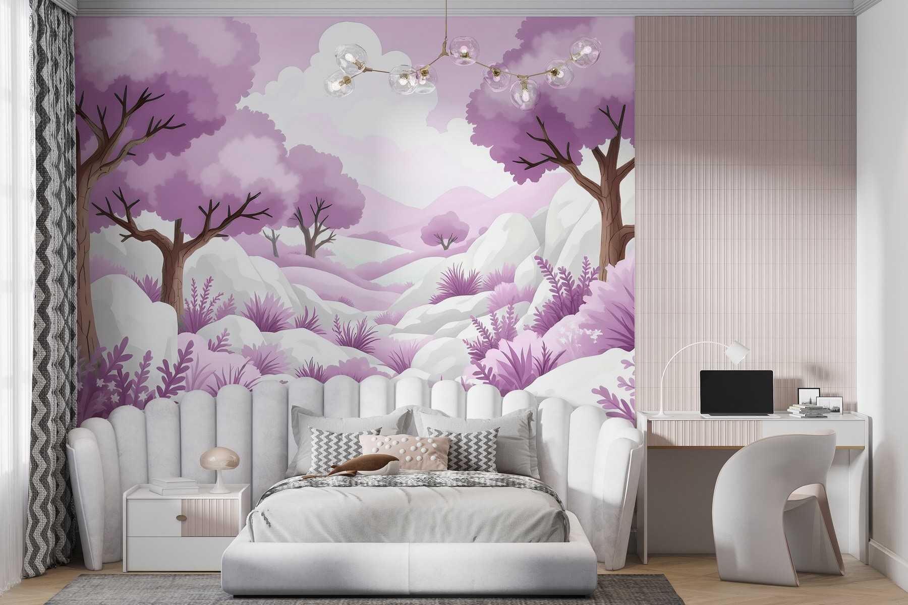 Transform any room into a dreamy escape with this enchanting wall mural, “Landscape with Trees and Snow.” Picture stepping into a whimsical forest, where soft lavender trees sway gently, surrounded by fluffy snow and delicate plants. It’s like a magical world where winter plays nice with spring!