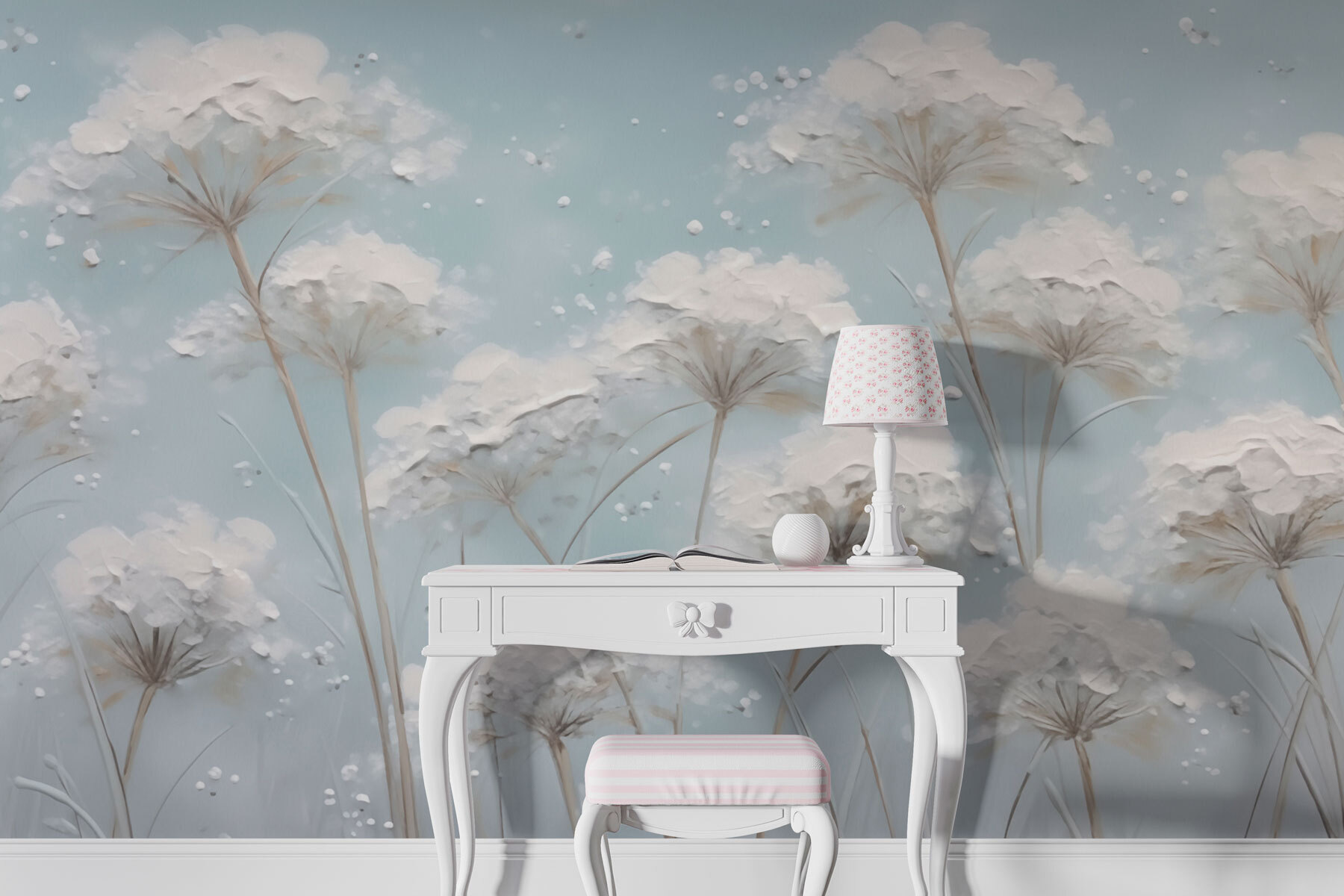 Transform your walls with this dreamy mural featuring flowers dancing on a serene blue backdrop. Imagine stepping into a tranquil garden right from your living room—soft petals, delicate blooms, and that peaceful vibe. It’s like opening a window to nature without the allergies! Perfect for creating a cozy nook for reading or simply sipping your morning coffee, it adds a touch of elegance to any space. Friends will probably ask if you’ve had a secret gardening spree, but really, it’s just your fantastic taste in decor. This mural invites warmth, freshness, and maybe even a little daydreaming—each glance might just spark a smile!