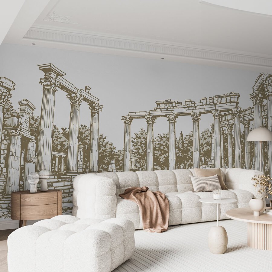 Transform any room into a captivating haven with this mural featuring a stunning stone structure adorned with elegant columns. Imagine walking into your space only to be greeted by a glimpse of ancient history, where stories of the past whisper from every detail. The gentle earthy tones create a warm ambiance that’s both inviting and calming. Whether it’s the backdrop for lively conversations or just a cozy nook to unwind, this mural sparks the imagination. You might even catch yourself daydreaming about epic adventures among ruins, feeling a little like a time traveler in your own home. It’s decor with a narrative—perfect for those seeking something truly special.
