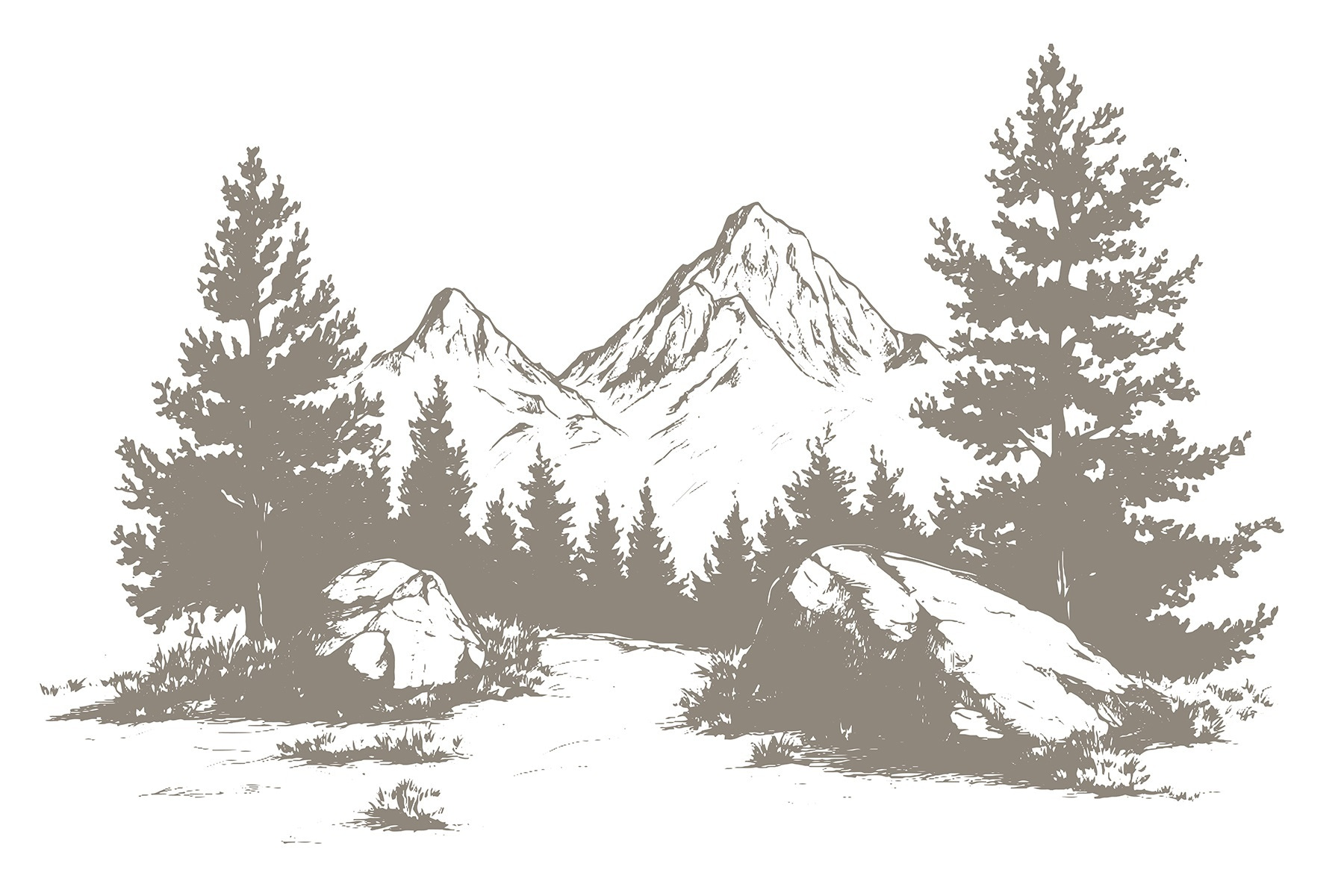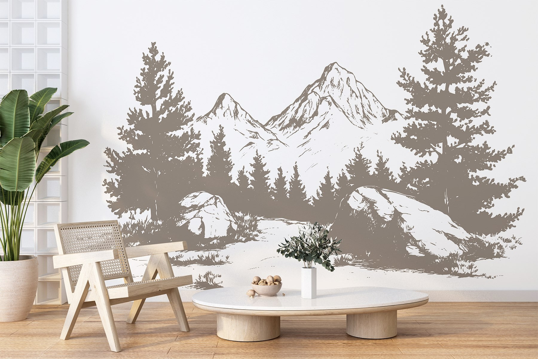 Transform any space into a serene retreat with this lovely mural featuring a majestic mountain range surrounded by trees and rocks. Picture walking into the room and instantly feeling the calming effects of nature, as if the great outdoors have invited themselves in. This mural whispers adventure, bringing to mind cozy campfire nights and fresh mountain air. It’s perfect for rooms where relaxation is key—like a reading nook or a home office. With earthy tones and detailed artistry, it’s sure to spark a sense of wonder every single day. Time to let those walls tell a story!