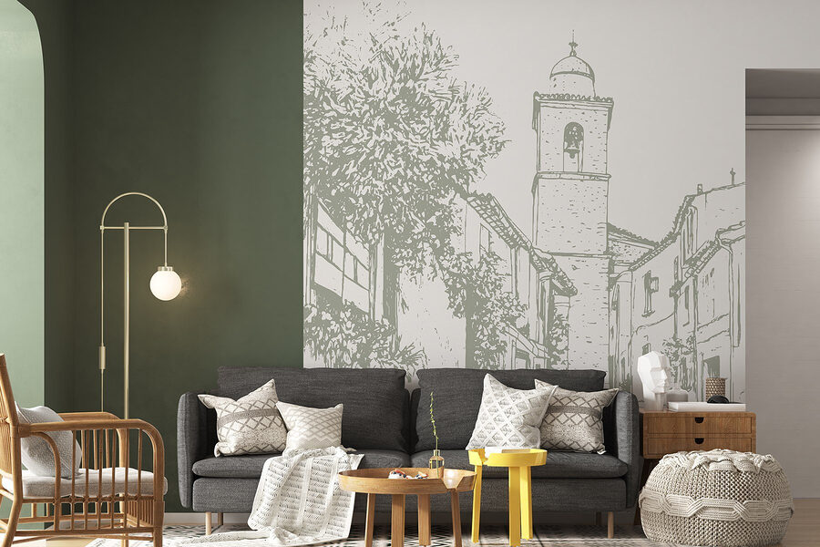 Transform any room into a charming escape with this mural. It’s like stepping into a lovely village street, complete with quaint buildings and a stunning bell tower. Just picture it: you come home after a long day, and this mural transports you somewhere serene and picturesque.