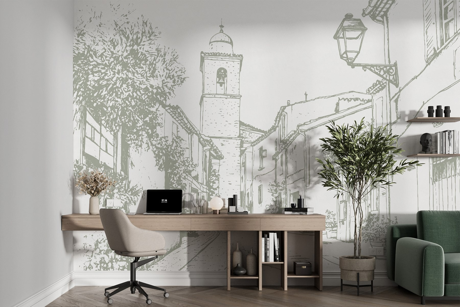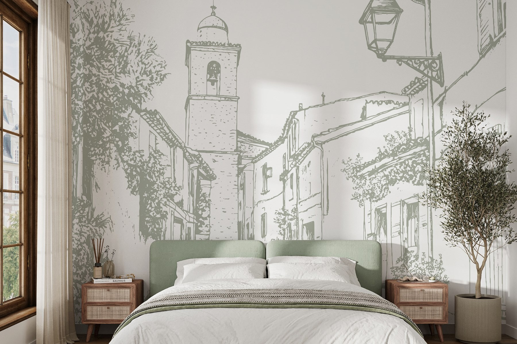 Transform any room into a charming escape with this mural. It’s like stepping into a lovely village street, complete with quaint buildings and a stunning bell tower. Just picture it: you come home after a long day, and this mural transports you somewhere serene and picturesque.
