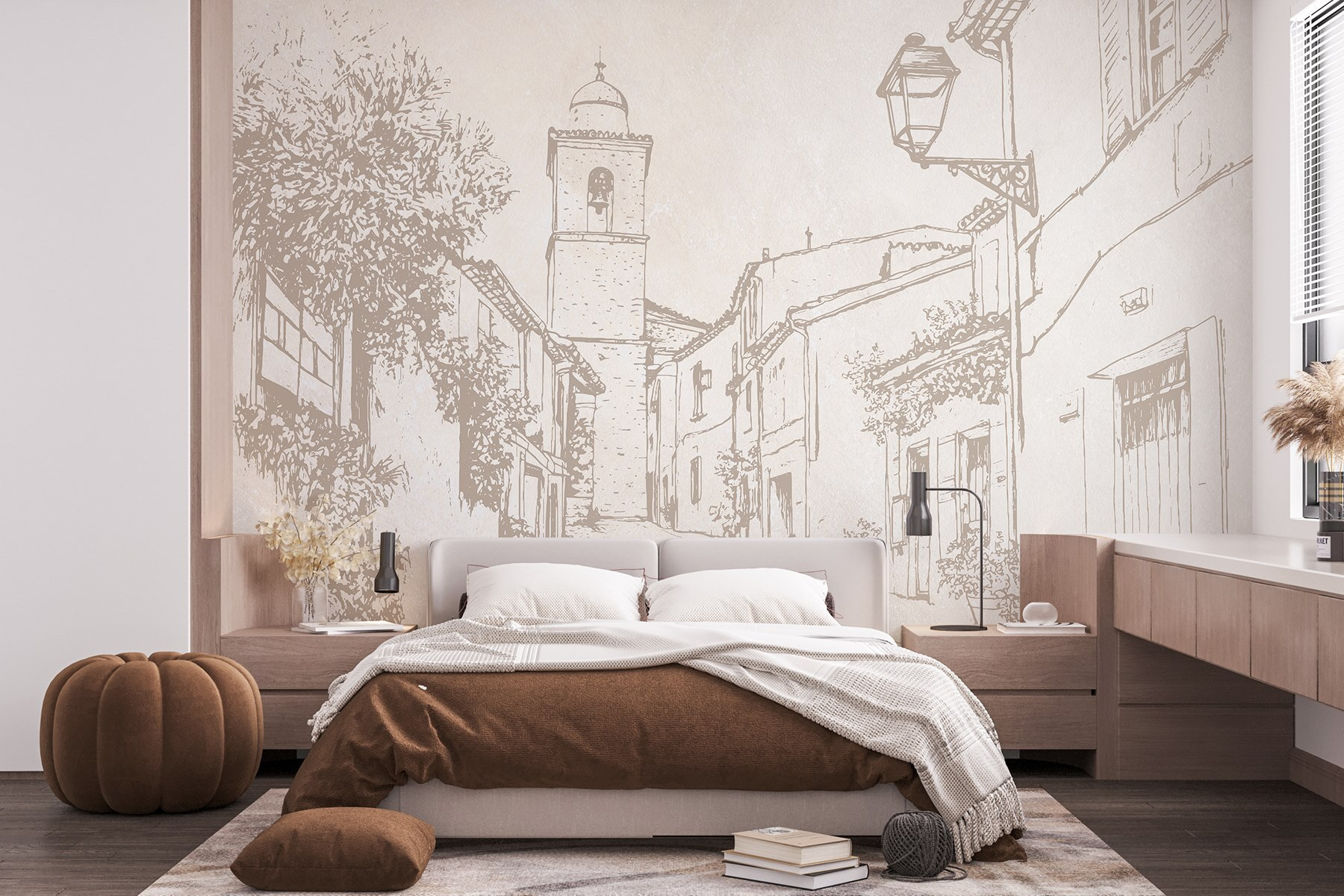 Transform your space with this charming wall mural featuring a quaint street scene topped by a lovely bell tower. It’s like inviting a slice of a cozy European village right into your living room. Imagine settling down with a cup of coffee, the gentle curves of the cobblestone streets almost luring you to take a stroll. The muted linework feels relaxed, yet full of life—perfect for daydreaming about sunlit afternoons spent exploring. This mural adds character without yelling for attention, making it a wonderful backdrop for those quiet moments. Who wouldn’t want to get lost in a scene like this?