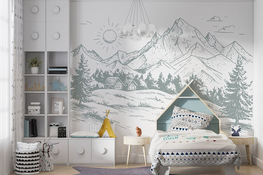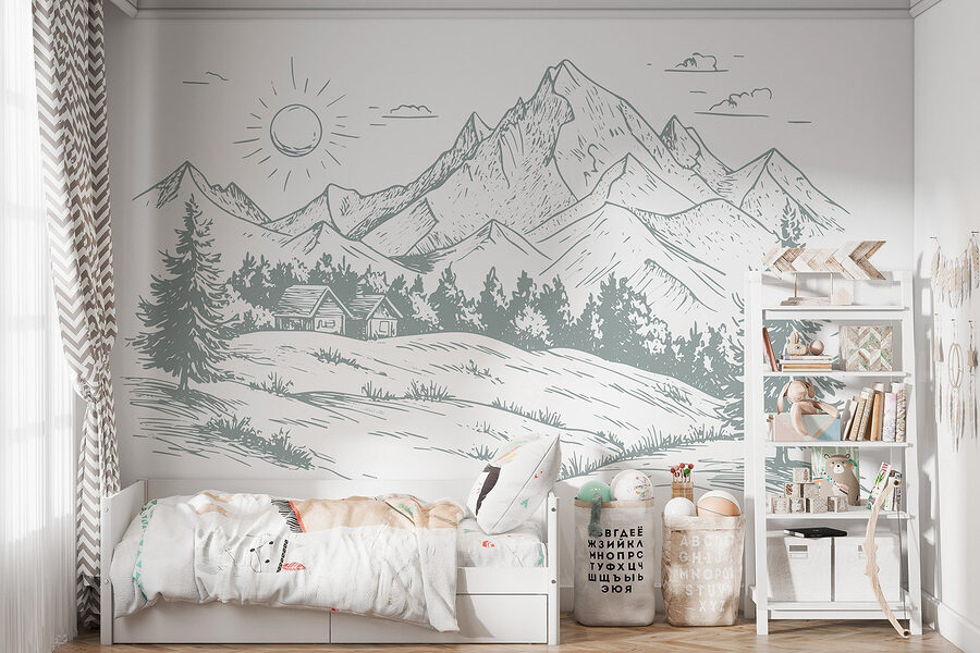Transforming a space doesn’t always have to mean a full remodel. Imagine a cozy scene with mountains and trees that whispers “let’s relax” every time you walk by. This mural is like bringing a little slice of nature indoors, with its serene outlines and inviting landscape. Picture sipping a cup of coffee, gazing at that gentle sunlight peeping through pines, feeling the calm wash over you. It’s perfect for a reading nook or the home office—turning mundane moments into something special. Who wouldn’t want that? Let your walls tell a story of tranquility and warmth.