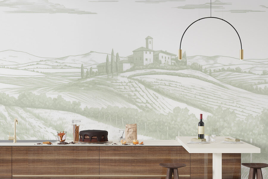Imagine walking into a room that feels like a serene countryside escape, thanks to this wall mural. Picture a gentle landscape, a charming house nestled among sprawling fields, and rows of lush greenery. The soft tones create a calming vibe, perfect for those quiet moments with a cup of tea or while flipping through a favorite book.