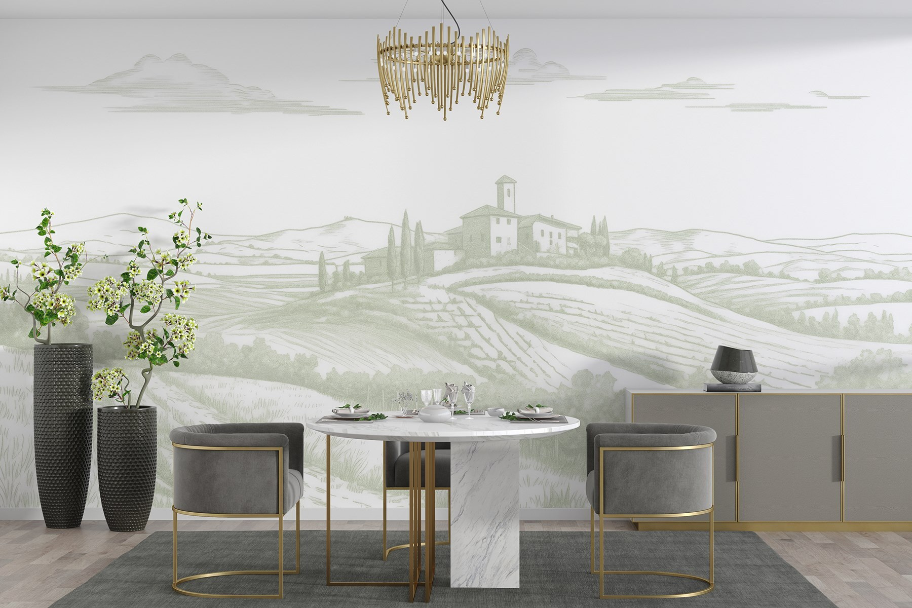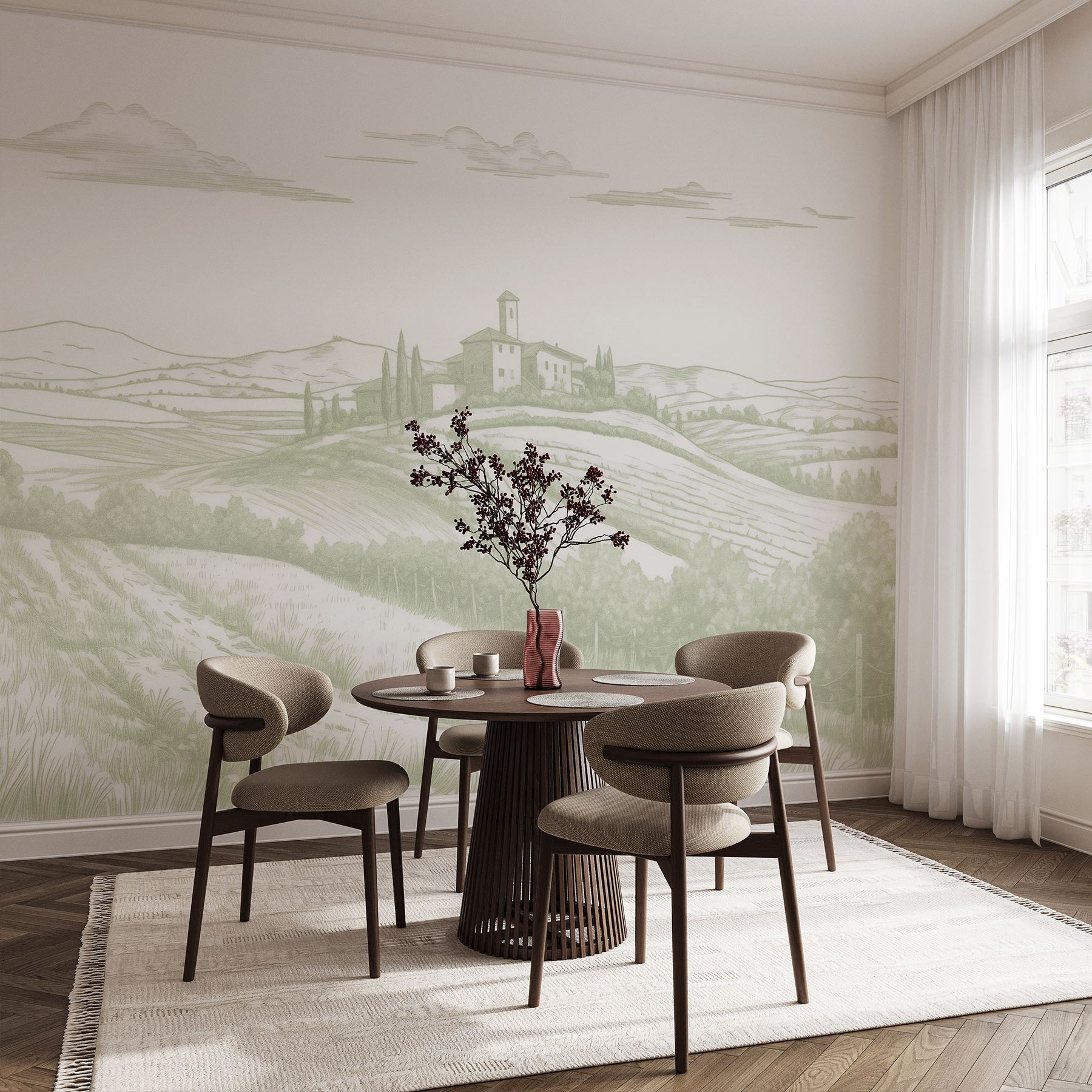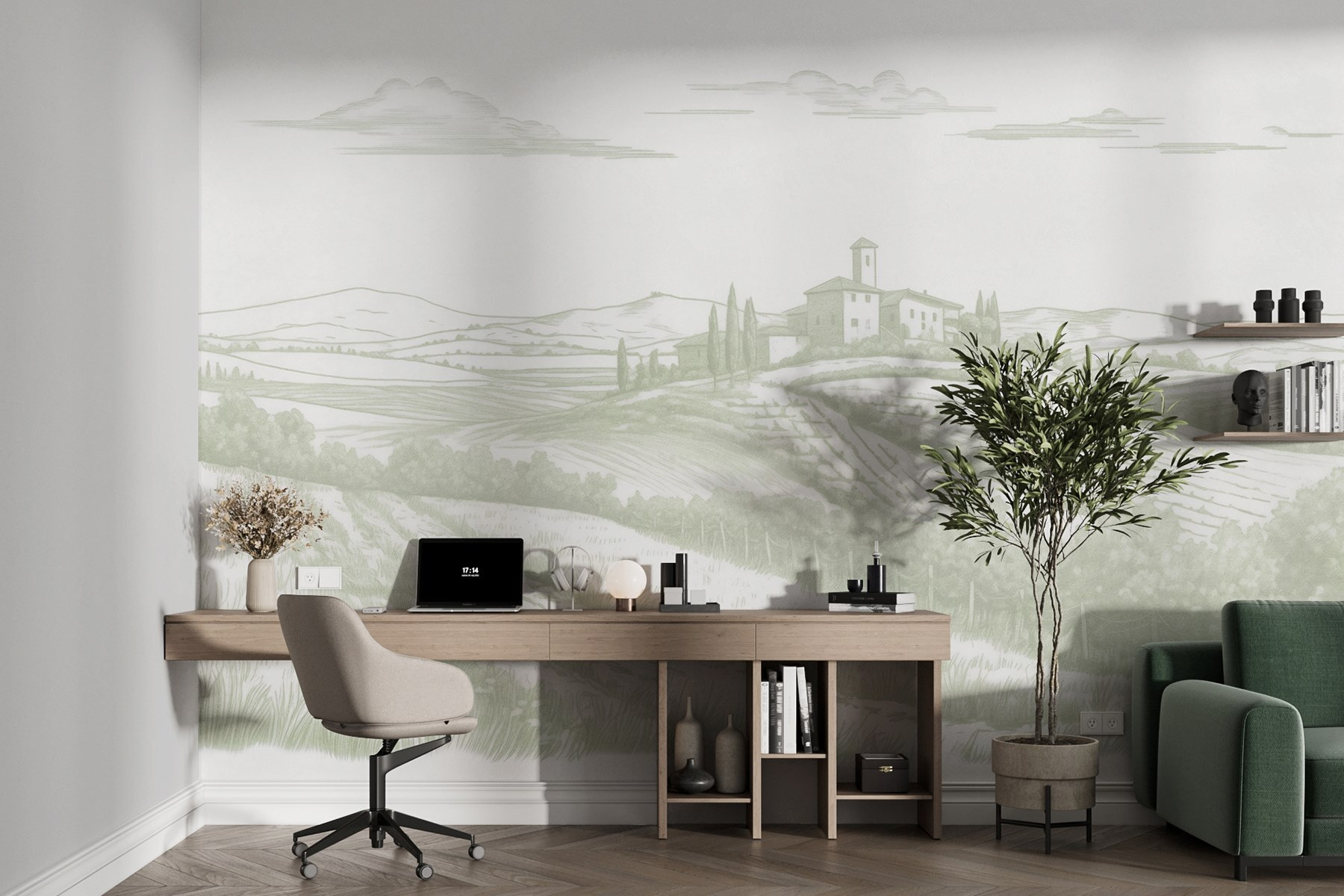 Imagine walking into a room that feels like a serene countryside escape, thanks to this wall mural. Picture a gentle landscape, a charming house nestled among sprawling fields, and rows of lush greenery. The soft tones create a calming vibe, perfect for those quiet moments with a cup of tea or while flipping through a favorite book.
