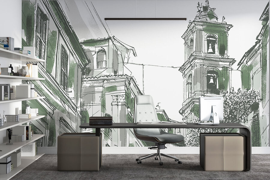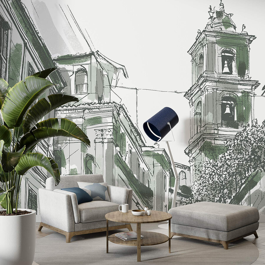 Transforming a room just got a lot more exciting with this charming mural featuring a delightful building with bells. It’s like bringing a slice of city life right into your space. Imagine starting your day with this view—coffee in hand, feeling inspired by the unique architecture. The soft colors and intricate lines invite you to explore every detail, sparking conversations and maybe even a little daydreaming. Perfect for a living room or home office, this mural sets a cozy, artistic vibe that’s hard to resist. Ideal for those who appreciate the beauty of urban landscapes without leaving their couch.