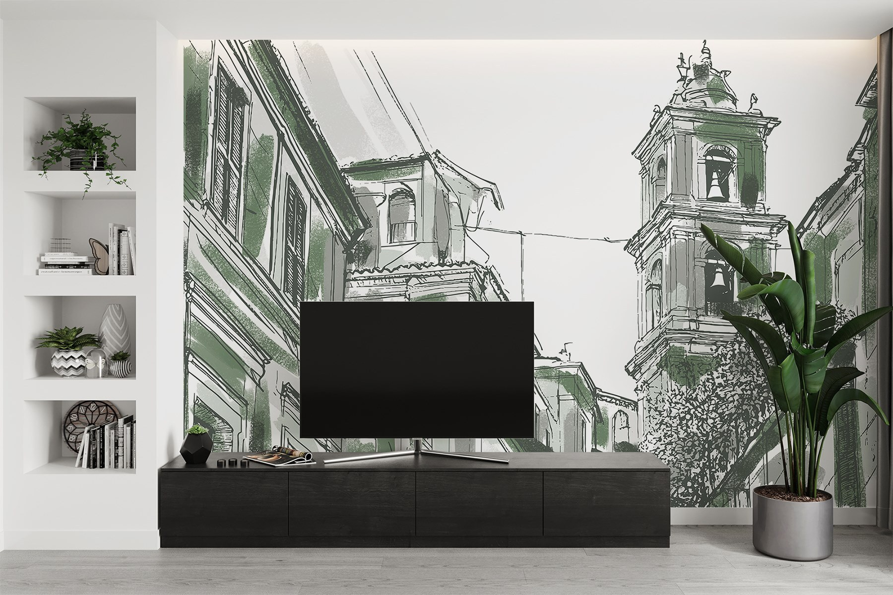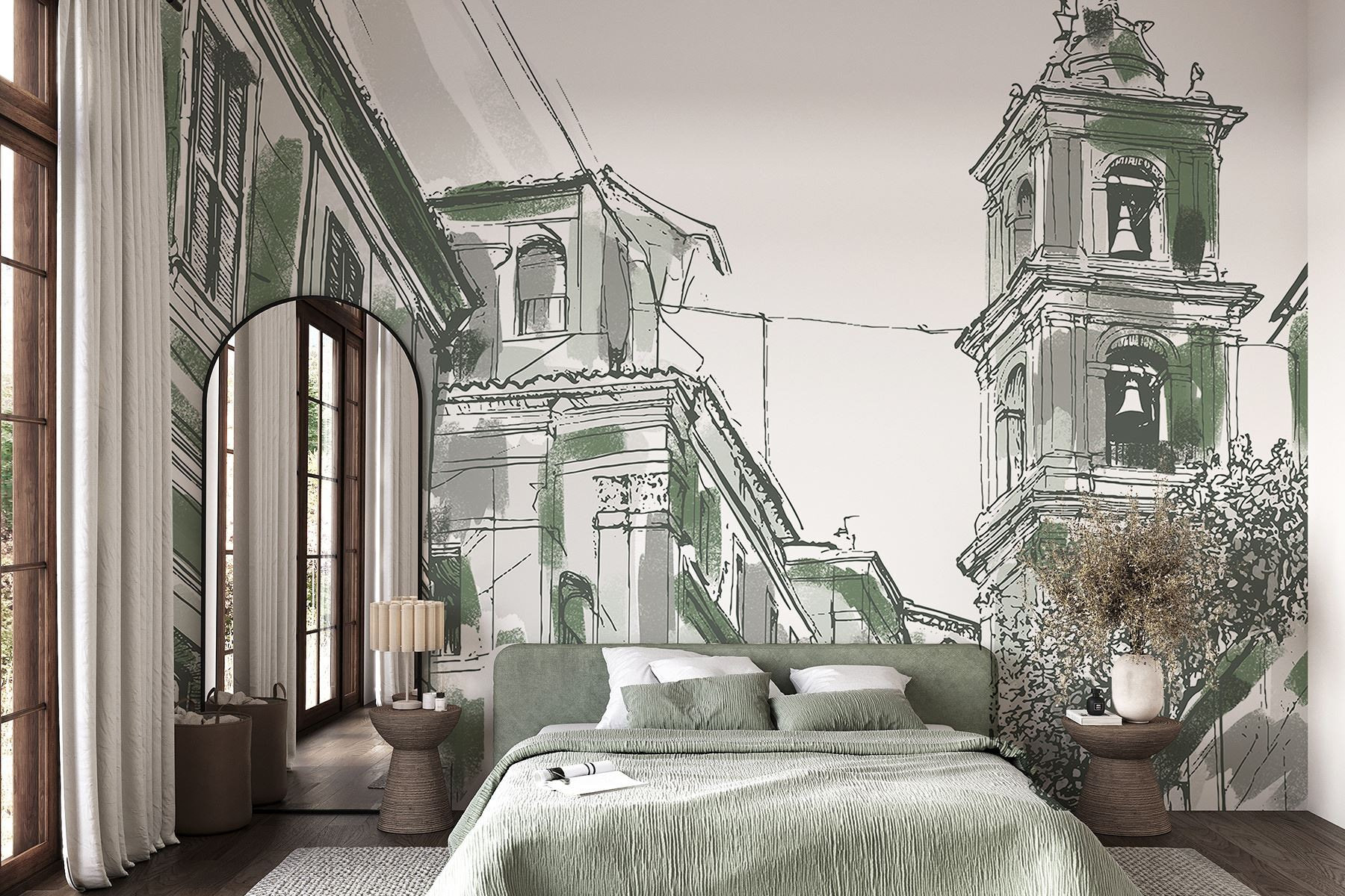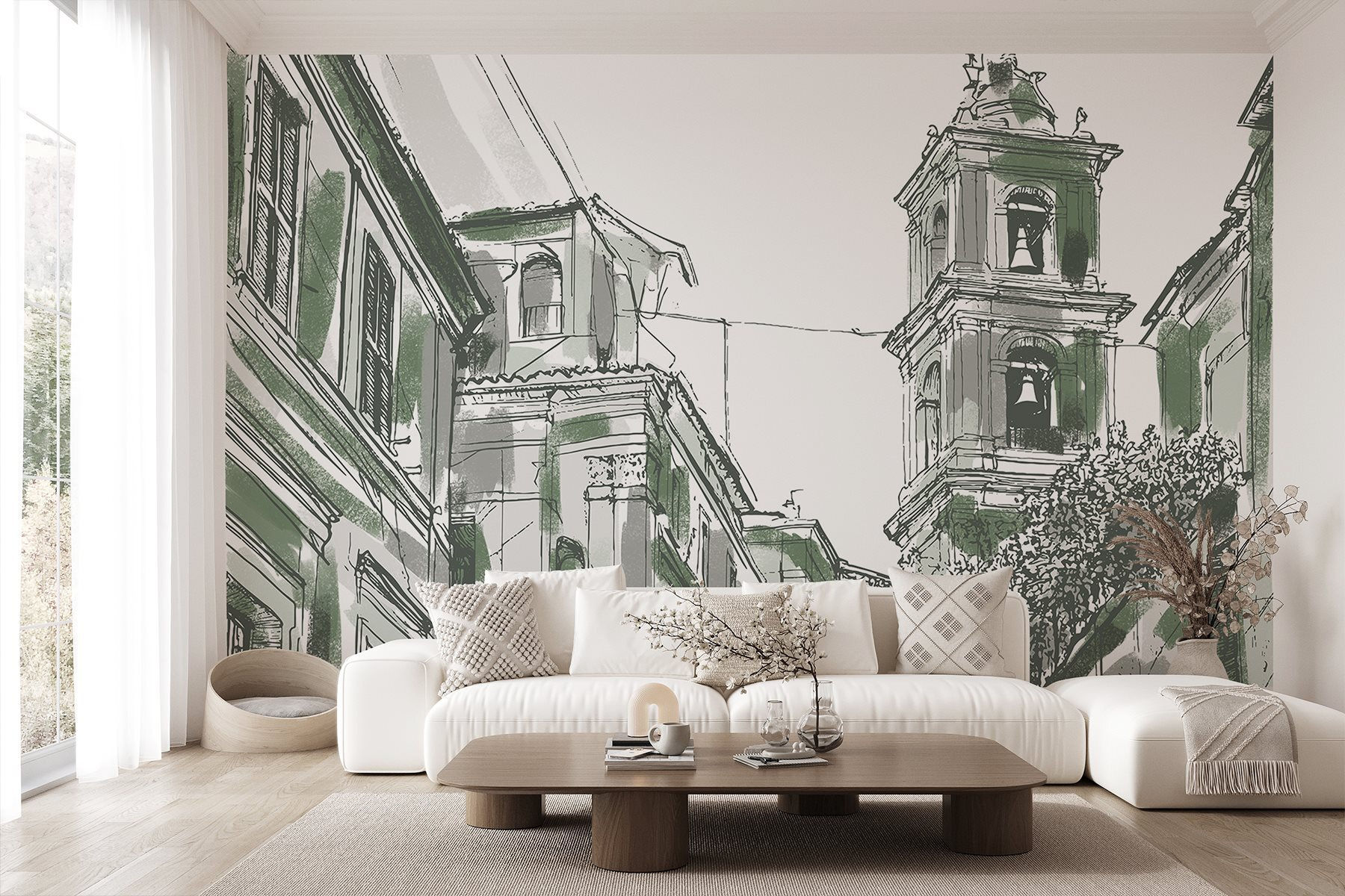 Transforming a room just got a lot more exciting with this charming mural featuring a delightful building with bells. It’s like bringing a slice of city life right into your space. Imagine starting your day with this view—coffee in hand, feeling inspired by the unique architecture. The soft colors and intricate lines invite you to explore every detail, sparking conversations and maybe even a little daydreaming. Perfect for a living room or home office, this mural sets a cozy, artistic vibe that’s hard to resist. Ideal for those who appreciate the beauty of urban landscapes without leaving their couch.