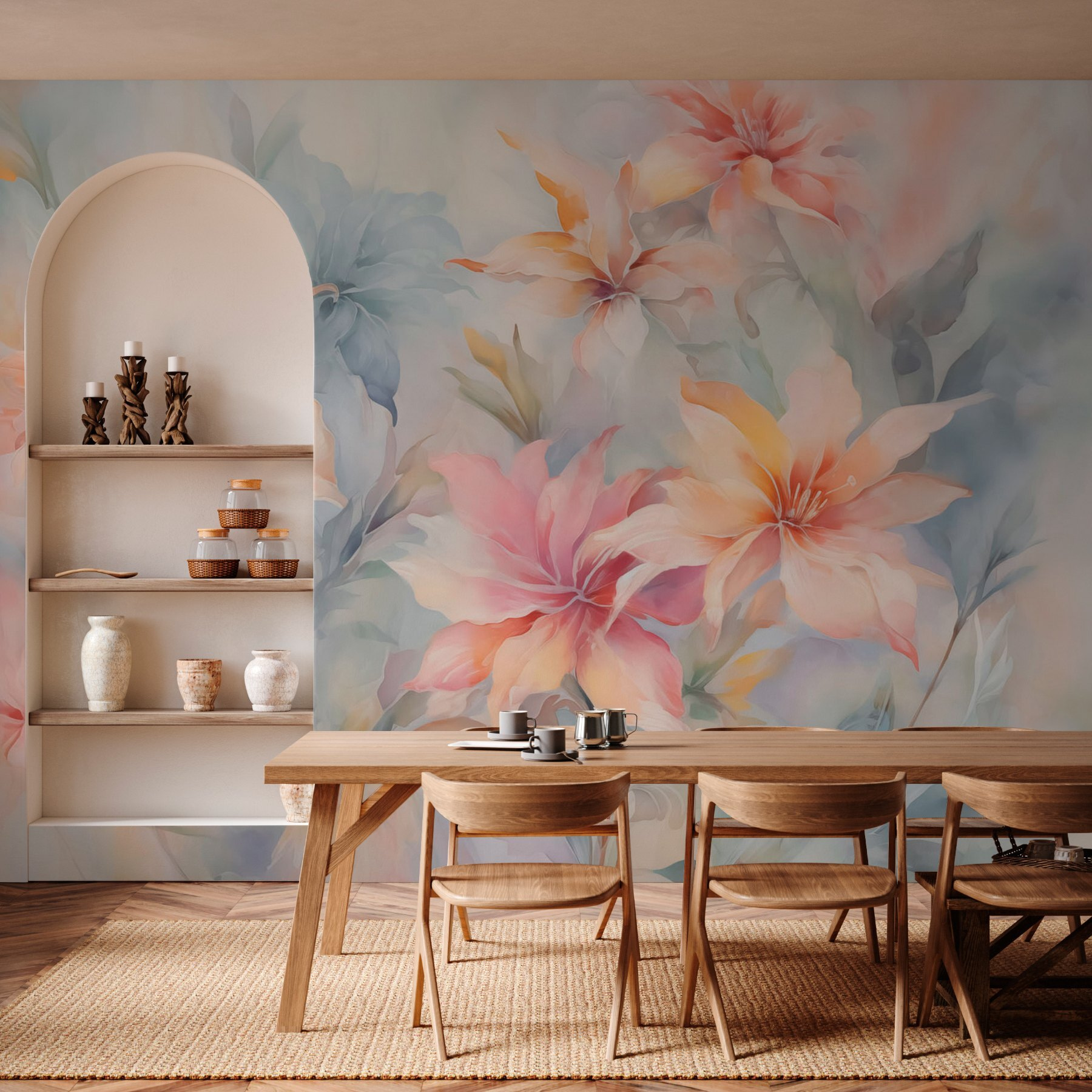 Transform any room into a serene floral paradise with this stunning wall mural. Imagine stepping into a world where soft blooms dance across your walls, whispering tales of calm mornings and peaceful afternoons. The gentle hues of pink and blue create an inviting atmosphere, perfect for those cozy reading nooks or lively dinner parties. It’s like bringing a garden indoors, minus the watering can. Guests will be drawn to it, sparking conversations about artistry and nature. Just picture unwinding here, letting the idyllic floral vibes wash over you—now that’s a breath of fresh air!