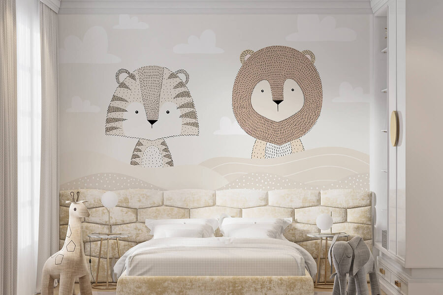 Transform any child’s room into a whimsical adventure with this playful mural featuring a lion and a tiger lounging in a dreamy desert setting. Imagine the stories sparked about distant lands, as little ones sit wide-eyed, captivated by their furry friends basking under fluffy clouds. The earthy tones and soft lines create a cozy vibe, making it perfect for snuggling up with a good book. It’s like bringing a slice of safari magic home, inviting charm and laughter into everyday life. Who wouldn’t want a lion and tiger as companions?