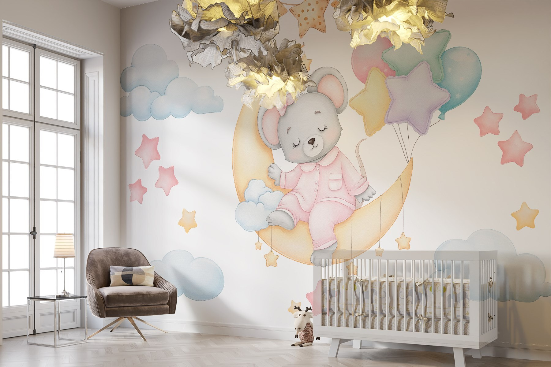 Transform a child’s space into a dreamy wonderland with this delightful wall mural featuring a cute mouse perched on the moon, holding on to colorful balloons. Picture a cozy room filled with soft giggles and bedtime stories, where this enchanting scene invites sweet dreams and playful imagination. The pastel colors bring a calming vibe that can make any space feel like a whimsical escape. Imagine curling up with your little one, sharing stories about the mouse’s moonlit adventures—who knows what secrets it keeps? Perfect for nurseries or playrooms, this mural sparks joy that’ll last well beyond the toddler years.
