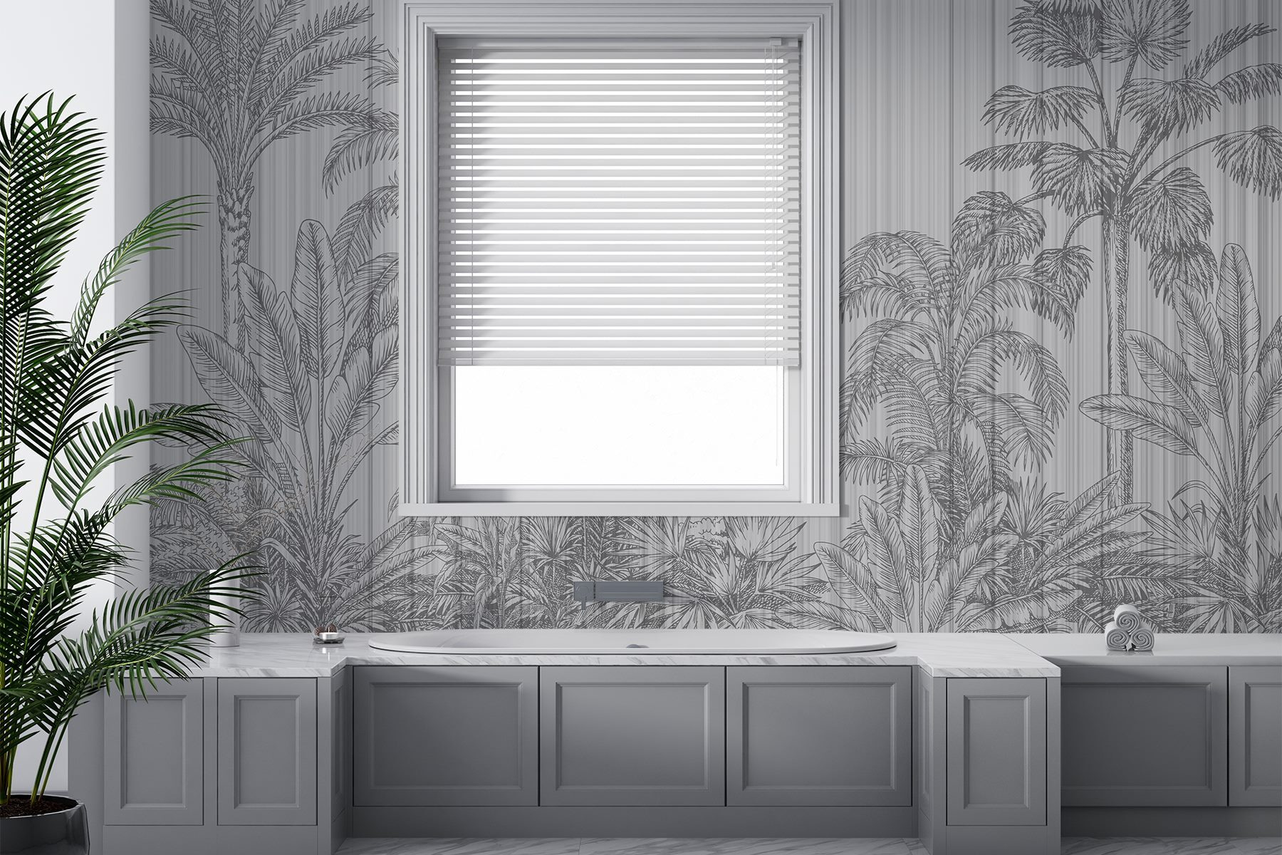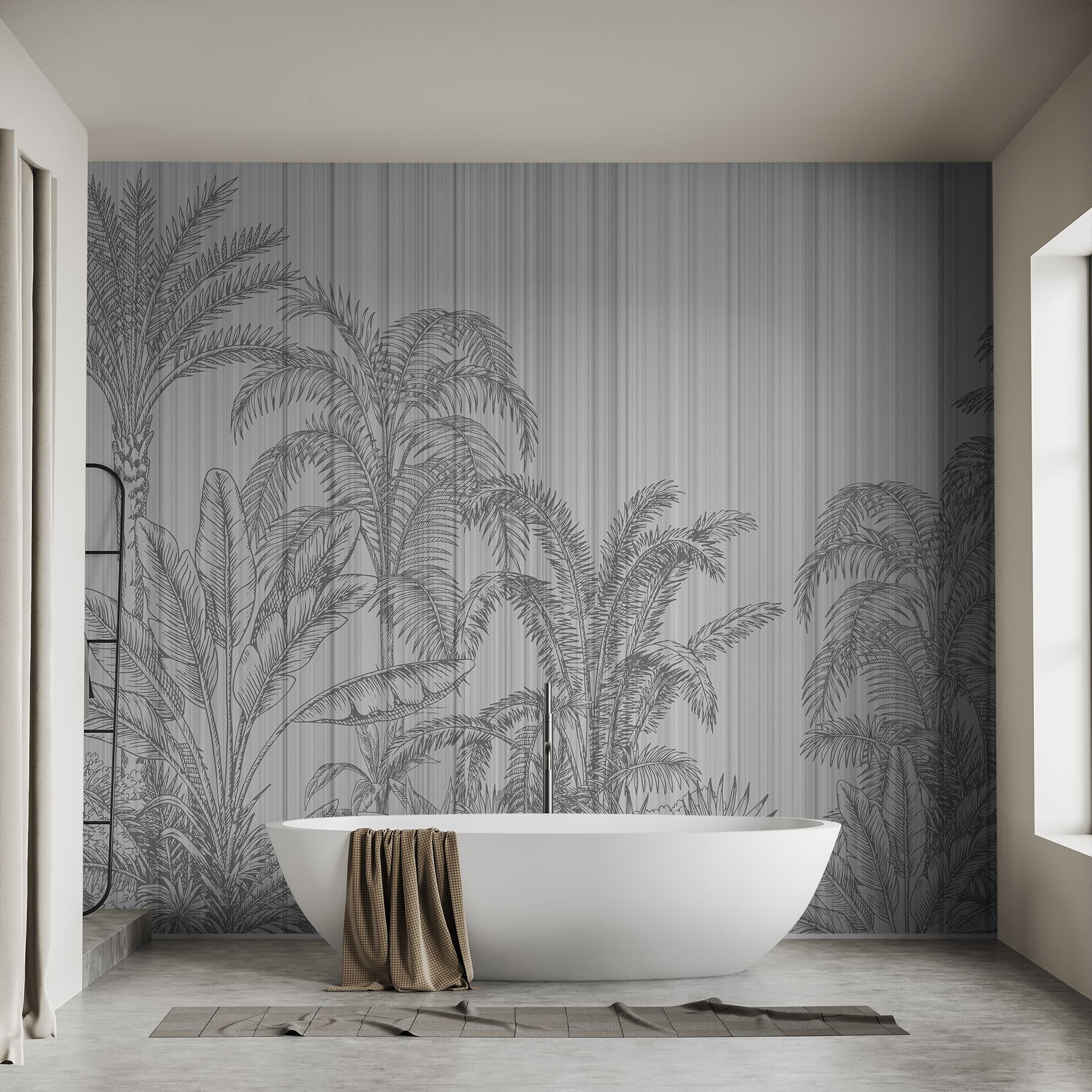Transform any room into a tropical escape with this stunning mural featuring palm trees against a soft grey and white backdrop. It’s like bringing a slice of vacation home, minus the sandy toes! Perfect for that blank wall that’s just begging for some personality, this mural adds a touch of nature without overwhelming the space. Imagine sipping your morning coffee in front of it, feeling the gentle breeze—even if it’s just the fan. It’s a conversation starter, too! Guests will be curious about this dreamy backdrop that’s all about chill vibes.