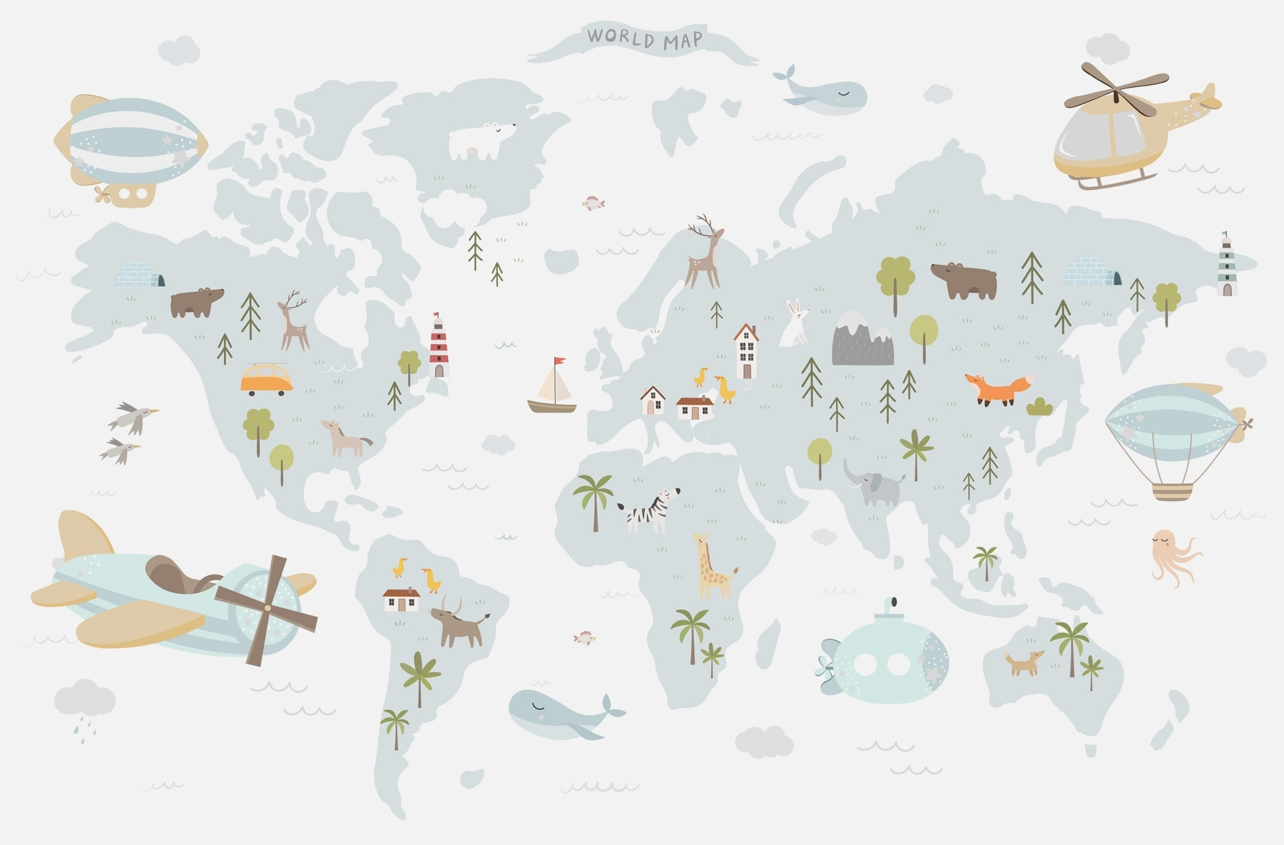 Transform any room into a delightful adventure with this charming wall mural of the world. Imagine little explorers, wide-eyed and curious, tracing their fingers along the gentle outlines of continents and quirky illustrations of animals. From playful whales to hot air balloons floating in the sky, each detail invites a sense of wonder. It’s like having a storybook come alive on your wall, sparking conversations and endless daydreams.
