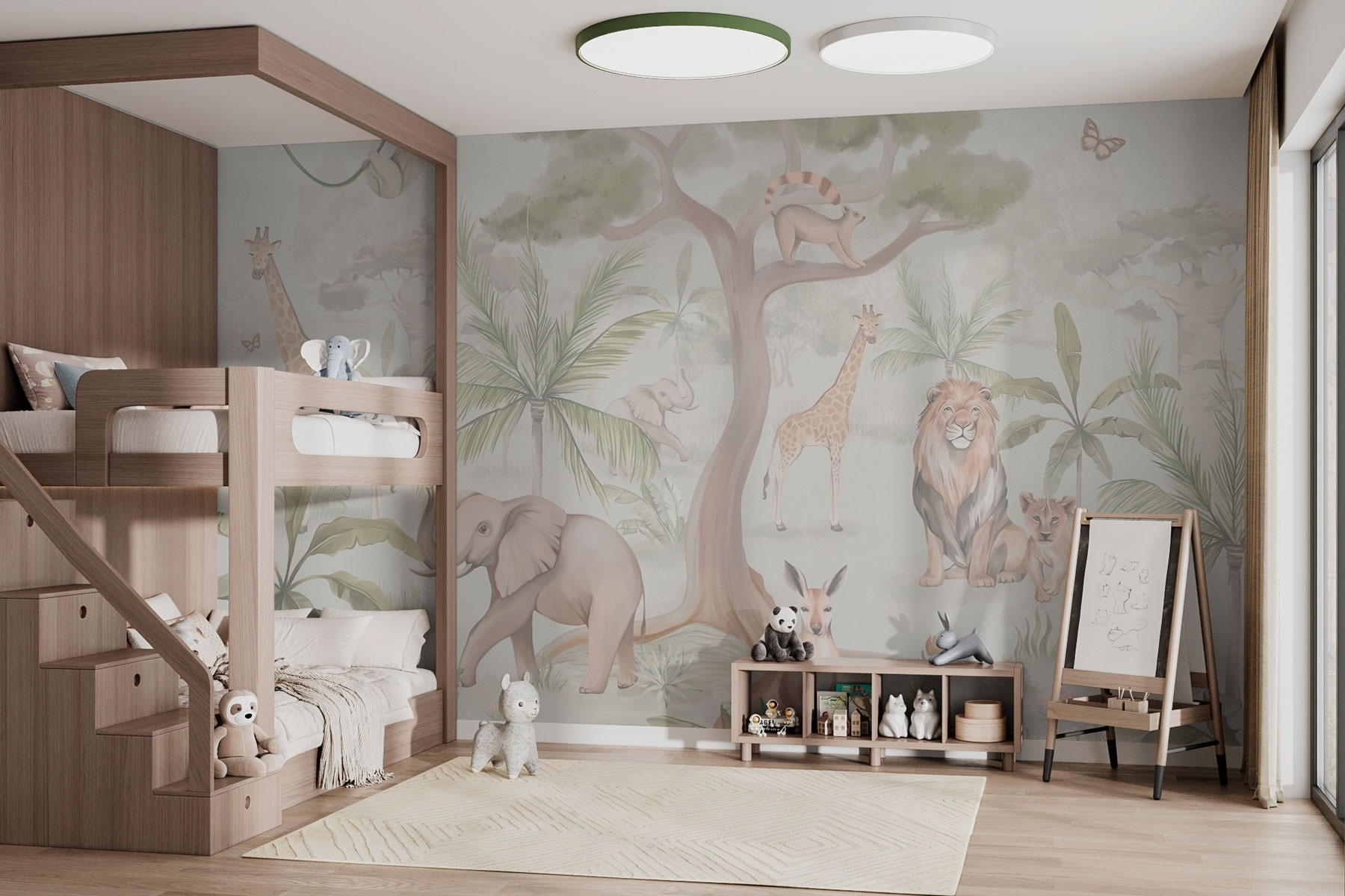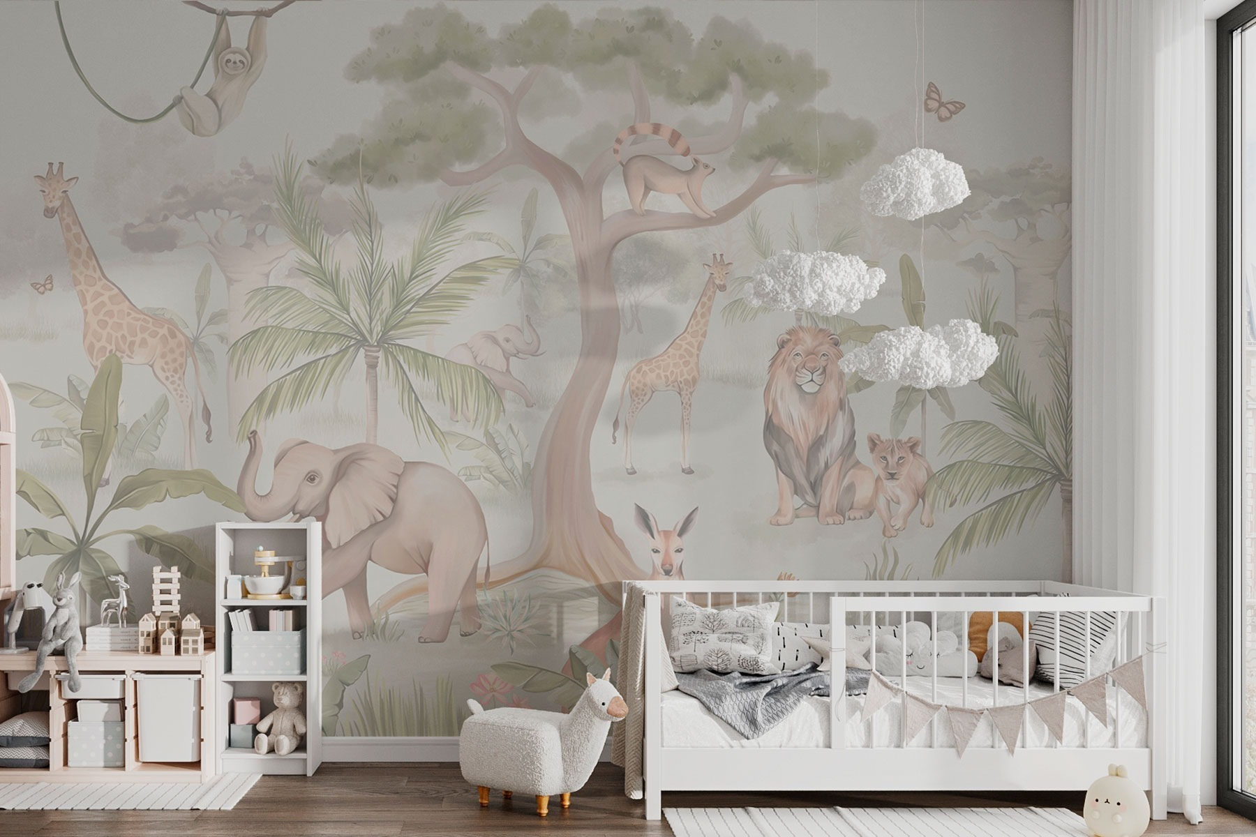 Transform any room into a wild paradise with this stunning wall mural featuring animals and trees. Imagine stepping into a serene jungle where a sloth dangles lazily, while a proud lion gazes majestically nearby. The soft colors will wrap around you, almost like nature’s own embrace. Perfect for a kid’s room or a cozy reading nook, this mural sparks imagination and adventure. Make every day feel like a safari, where storytelling happens amidst lush landscapes and friendly critters. Get ready for compliments and maybe a few wild dreams!
