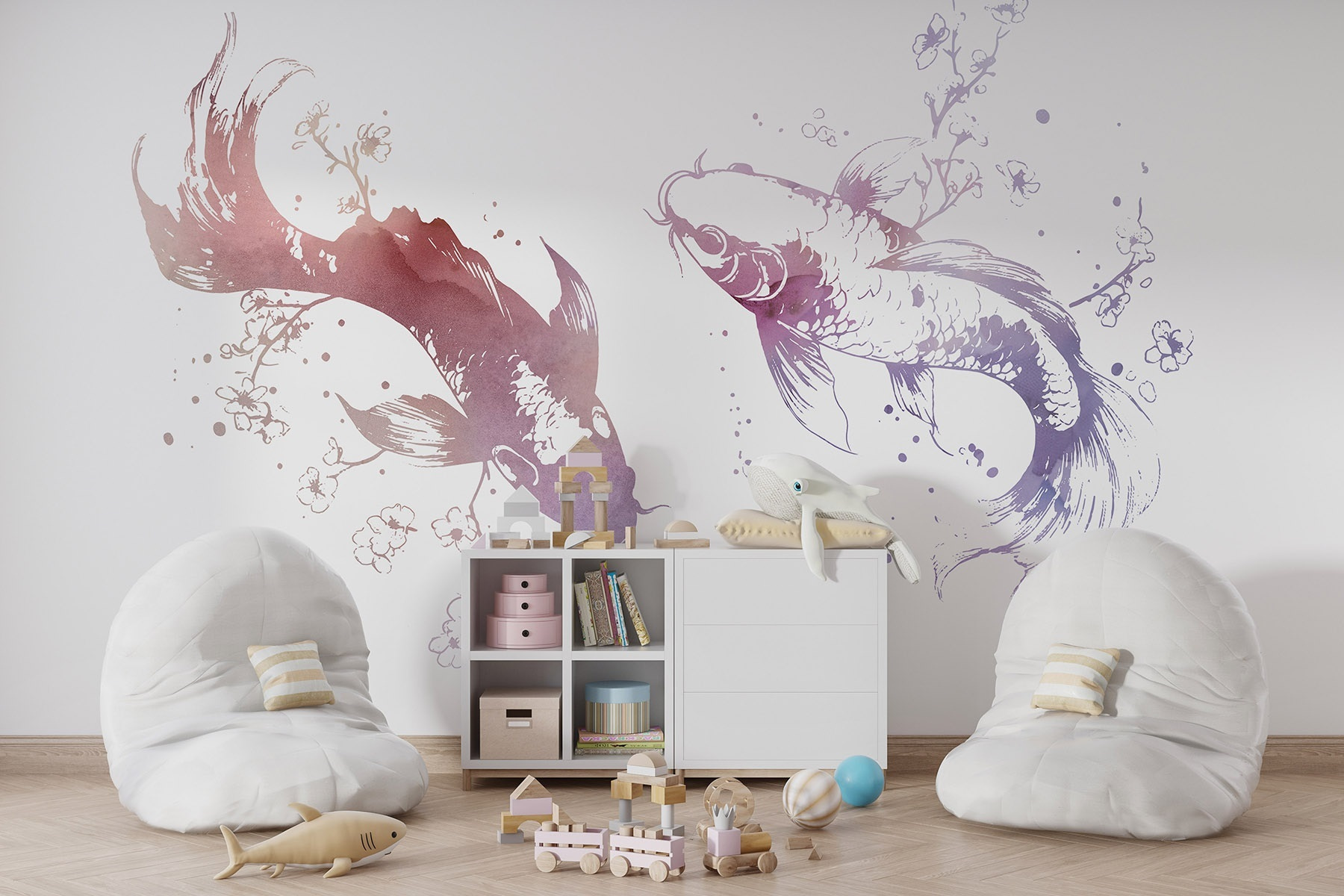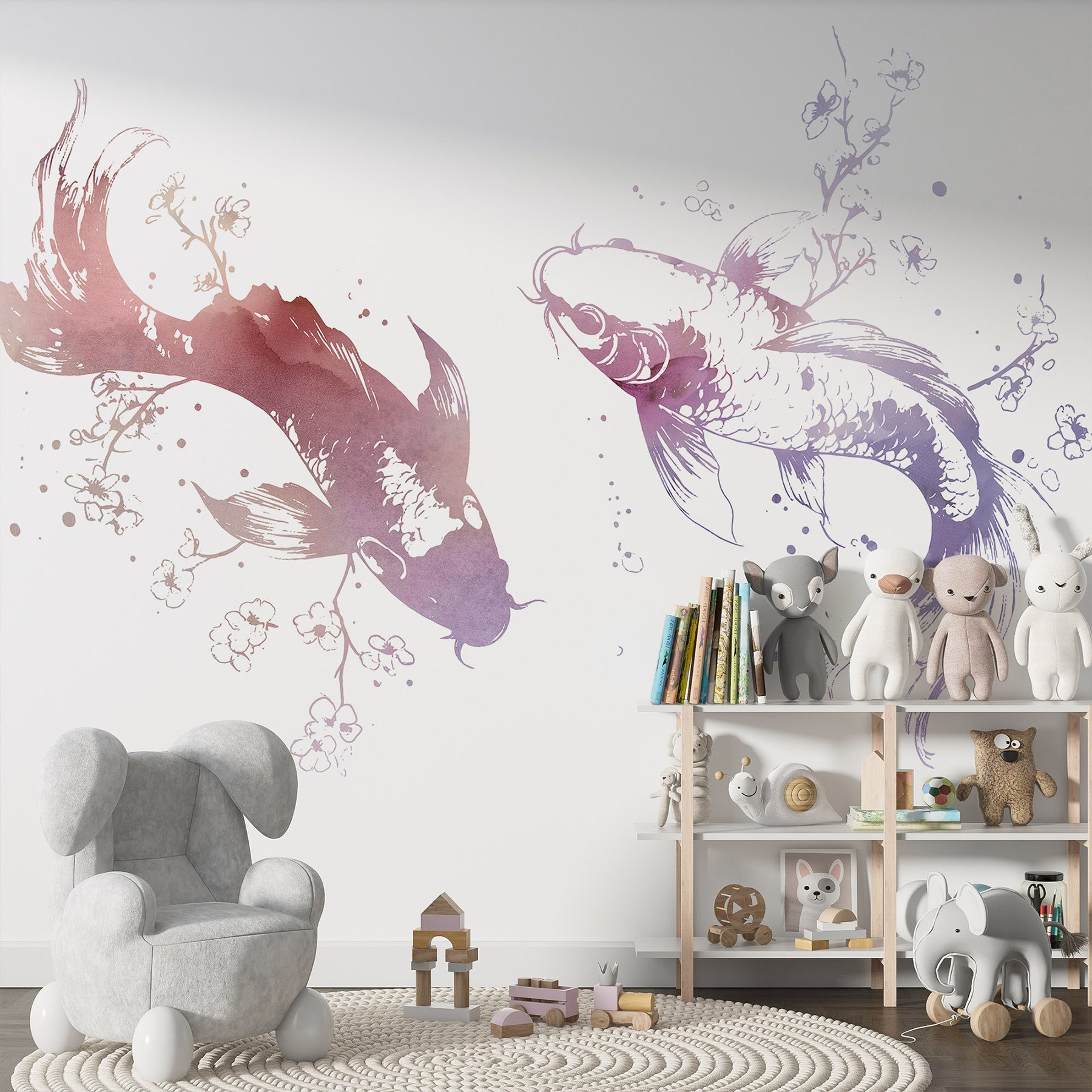 Transform your space with this enchanting mural of two graceful fish amidst blossoms and leaves. Imagine stepping into a serene underwater garden every time you walk into the room. The soft watercolor style adds a gentle touch, and it’s like the sea is whispering sweet nothings right on your wall. Friends might even mistake it for a calming art piece you found at some chic gallery. It’s perfect for creating that laid-back vibe—think sipping tea, catching up with friends, or just dreaming a little. Dive into a world where every glance feels like a peaceful swim through nature’s beauty. Who knew wall art could be so enchanting?