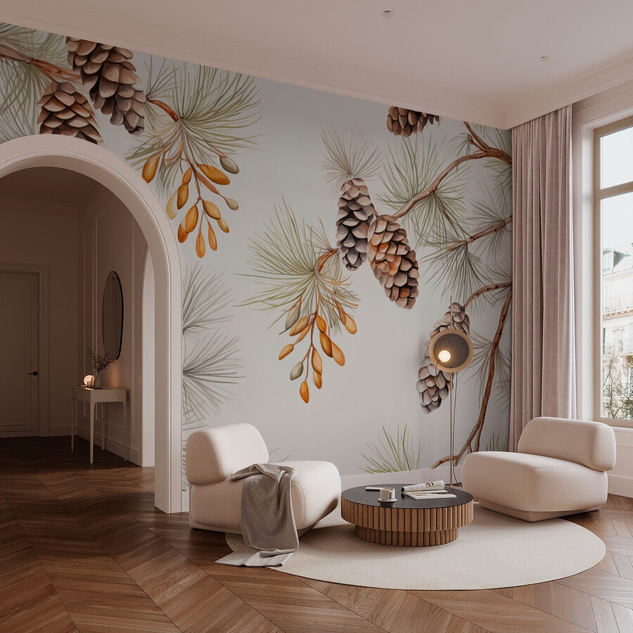 Transform your space with this enchanting wall mural featuring a lovely dance of pine cones and delicate needles. Imagine a cozy cabin vibe or a serene forest escape right in your living room. It’s like Mother Nature decided to pop in for a visit. The soft shades of greens and earthy tones create a soothing atmosphere—perfect for unwinding after a long day. Picture sipping tea while gazing at these charming details, or maybe it sparks a chat about hiking adventures. The mural’s natural elegance effortlessly brings warmth and a hint of whimsy to any wall. It’s not just decor; it’s a mini getaway every time you walk by. Who wouldn’t want a bit of that?