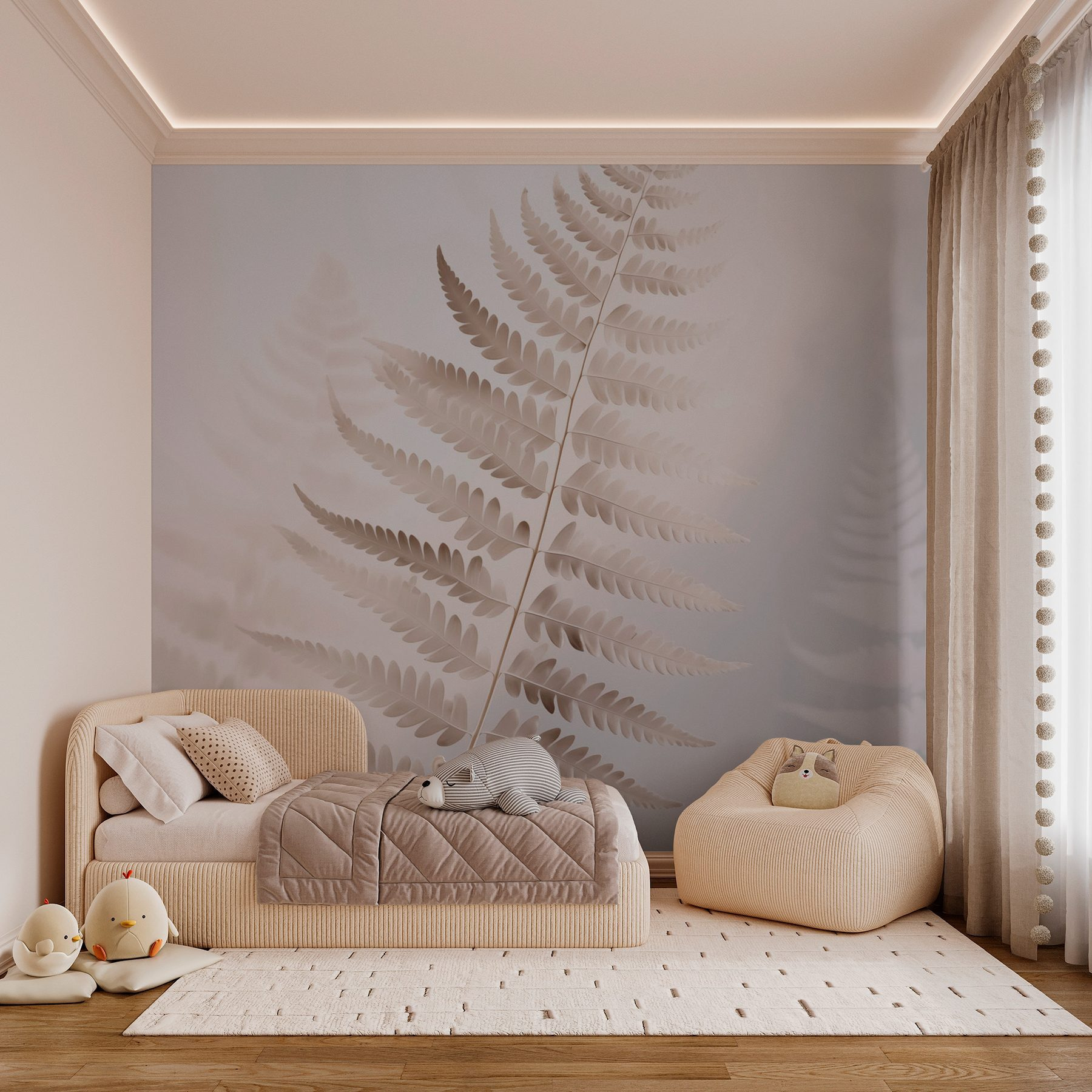 Transform your space with the “Delicate Fern in Soft Lighting” mural, where nature meets artistry. Picture this: a serene early morning, sunlight gently spilling into your room, while elegant ferns sway on the wall, whispering stories of tranquil forest strolls. It’s like having a slice of the outdoors, right in your cozy corner. This mural’s gentle hues set a calming vibe, perfect for unwinding after a long day. Friends will admire the beauty and ask, “Where’d you get that?” Perfect for bedrooms, living areas, or even a quiet office nook. Just imagine curling up with a book, surrounded by this peaceful, leafy embrace.