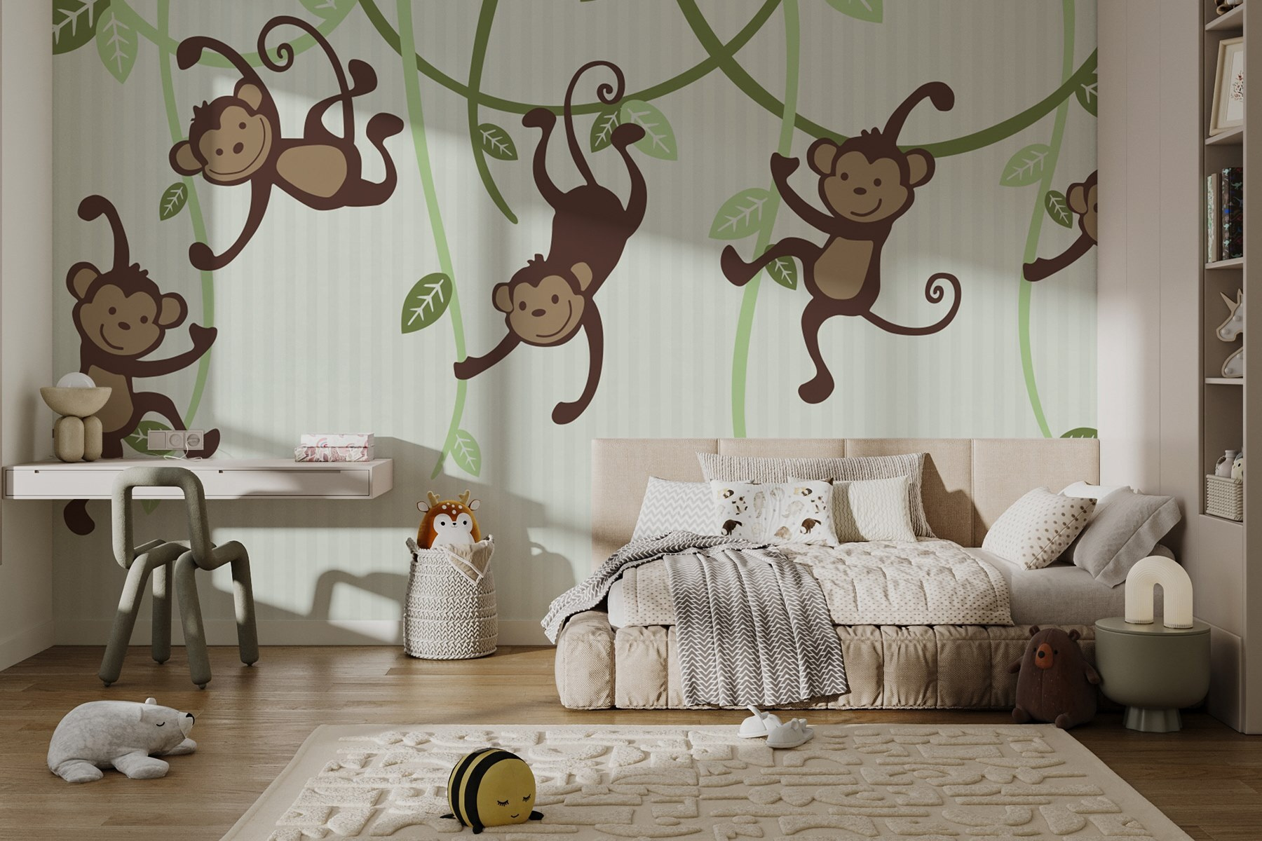 Imagine transforming a child’s room into a playful jungle where cheeky little monkeys swing from vines. This mural isn’t just a design; it creates a whole vibe! Perfect for sparking giggles and creativity, these adorable monkeys bring a sense of adventure right to the walls. Just picture the joy on tiny faces as they explore their own imaginative world. The soft greens and browns add a gentle touch, making it a cozy space for storytime or a nap after all that fun. Plus, it’s a delightful backdrop for your family photos—monkeys make everything more cheerful!