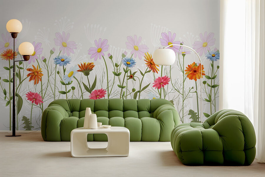 Transform your space into a vibrant garden with this wall mural of colorful flowers. Imagine walking into a room where cheerful blooms seem to sway with an invisible breeze, inviting warmth and joy. These delightful petals add a dash of nature’s charm, making any dull wall feel alive and filled with energy. It’s like bringing a piece of a sunlit meadow indoors—perfect for brightening up a cozy corner or creating a cheerful backdrop for gatherings. Just think about how a sprinkle of these colors can spark smiles and lift moods, turning everyday moments into something a bit more special. So go ahead, let these blossoms dance on your walls. They might just inspire a little happy daydreaming.
