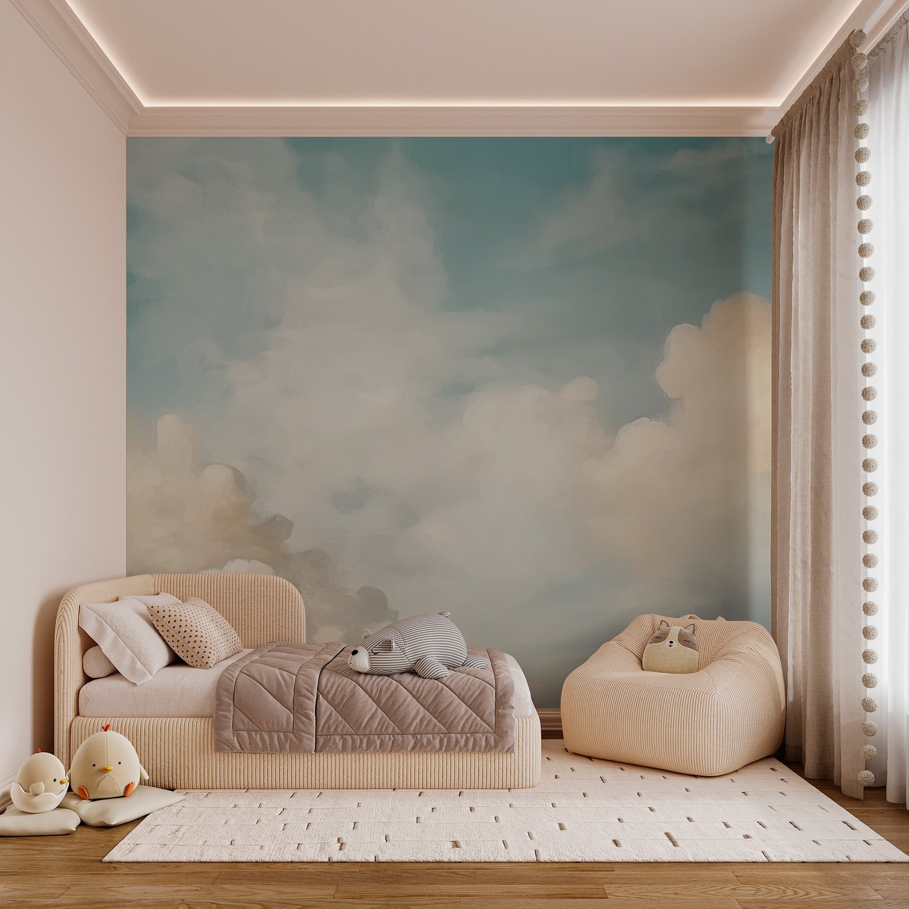 This mural doesn’t just decorate walls; it opens up an entire new vibe, making everything feel lighter and brighter. Perfect for a kid’s room, a cozy nook, or even a meditation space. And let’s be real, who doesn’t want to feel like they’re floating on clouds? Just think of the stories this mural could tell—like how it turns mundane moments into whimsical daydreams. Playful yet calming, it’s a gentle reminder that there’s beauty to be found in the everyday.