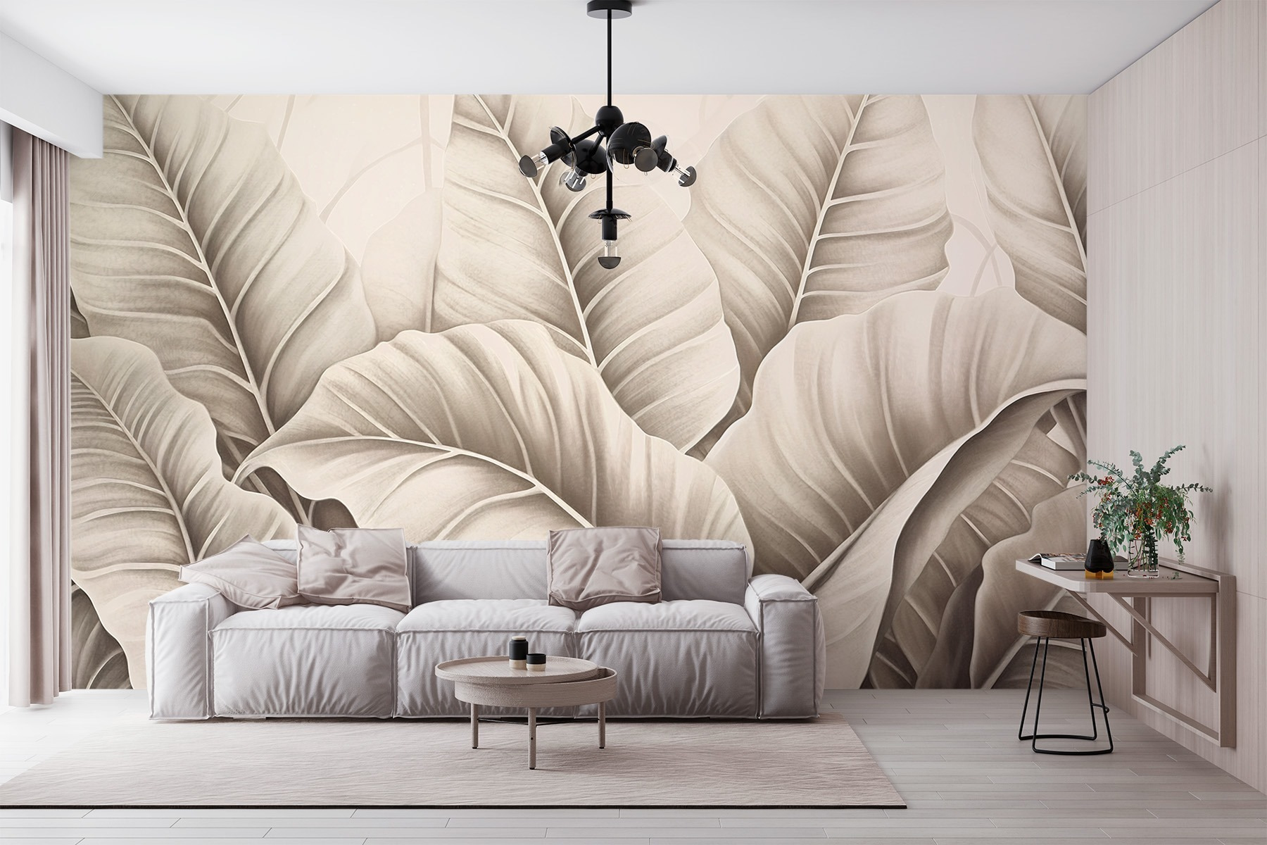 Transforming a space can be as simple as adding a stunning mural, and this one, folks, is a showstopper. Picture softly layered leaves unfolding gracefully, like nature’s own artwork in monochrome tones. It’s all about that calm vibe—imagine waking up to this refreshing sight, a sprinkle of serenity right in your living room. Friends will wonder if you’ve got a secret garden hidden away. The gentle hues mingle perfectly with just about any furniture, making it a versatile choice. Plus, there’s something about those leaves that invites a deep breath—like bringing a bit of the great outdoors inside. It’s subtle yet striking, whispering comfort and style in equal measure. Perfect for those who appreciate the finer details without too much fuss. Let your walls do the talking!