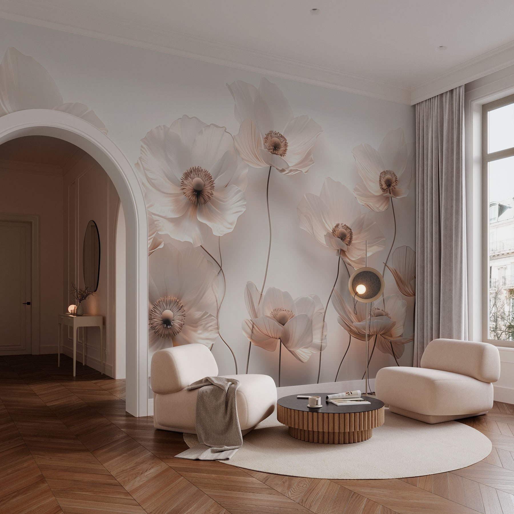 Looking to bring a breath of fresh air into your space? This mural, featuring a stunning group of white flowers, does just that. Imagine stepping into your room and feeling like you’ve wandered into a serene garden. Those elegant blooms practically invite you to stop and smell the roses—well, sort of! They bring a soft, tranquil vibe, perfect for a cozy reading nook or a relaxing bedroom retreat. The gentle shapes and subtle tones create a calming atmosphere, making it easier to unwind after a long day. It’s like having your own little piece of nature, no green thumb required. Plus, who doesn’t love a wall that’s just as easy on the eyes as it is on the heart?